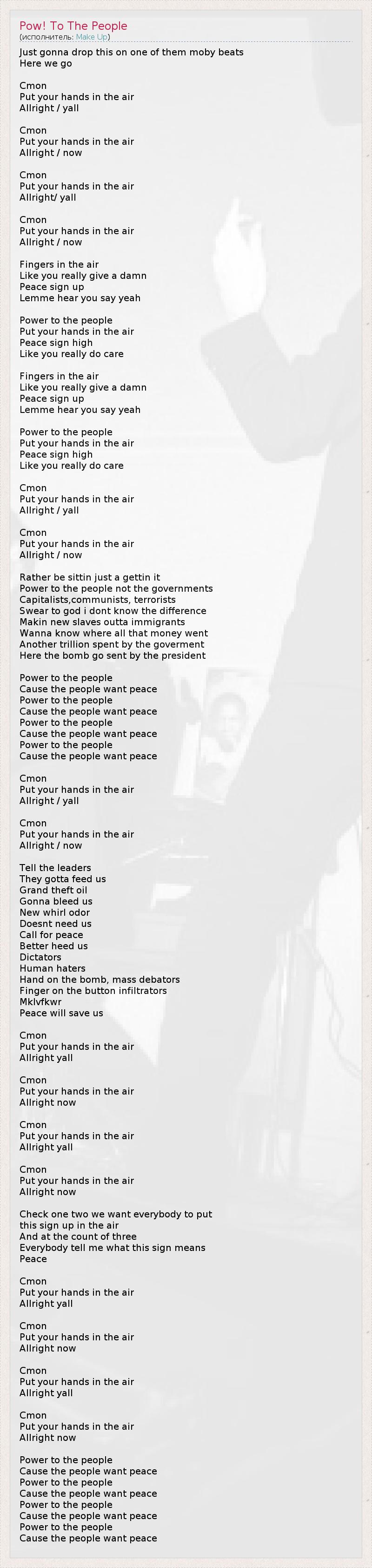 Just gonna drop this on one of them moby beats Here we go Cmon Put your hands in the air Allright / yall Cmon Put your hands in the air Allright / now Cmon Put your hands in the air Allright/ yall Cmon Put your hands in the air Allright / now Fingers in the air Like you really give a damn Peace sign up Lemme hear you say yeah Power to the people Put your hands in the air Peace sign high Like you really do care Fingers in the air Like you really give a damn Peace sign up Lemme hear you say yeah Power to the people Put your hands in the air Peace sign high Like you really do care Cmon Put your hands in the air Allright / yall Cmon Put your hands in the air Allright / now Rather be sittin just a gettin it Power to the people not the governments Capitalists,communists, terrorists Swear to god i dont know the difference Makin new slaves outta immigrants Wanna know where all that money went Another trillion spent by the goverment Here the bomb go sent by the president Power to the people Cause the people want peace Power to the people Cause the people want peace Power to the people Cause the people want peace Power to the people Cause the people want peace Cmon Put your hands in the air Allright / yall Cmon Put your hands in the air Allright / now Tell the leaders They gotta feed us Grand theft oil Gonna bleed us New whirl odor Doesnt need us Call for peace Better heed us Dictators Human haters Hand on the bomb, mass debators Finger on the button infiltrators Mklvfkwr Peace will save us Cmon Put your hands in the air Allright yall Cmon Put your hands in the air Allright now Cmon Put your hands in the air Allright yall Cmon Put your hands in the air Allright now Check one two we want everybody to put this sign up in the air And at the count of three Everybody tell me what this sign means Peace Cmon Put your hands in the air Allright yall Cmon Put your hands in the air Allright now Cmon Put your hands in the air Allright yall Cmon Put your hands in the air Allright now Power to the people Cause the people want peace Power to the people Cause the people want peace Power to the people Cause the people want peace Power to the people Cause the people want peace