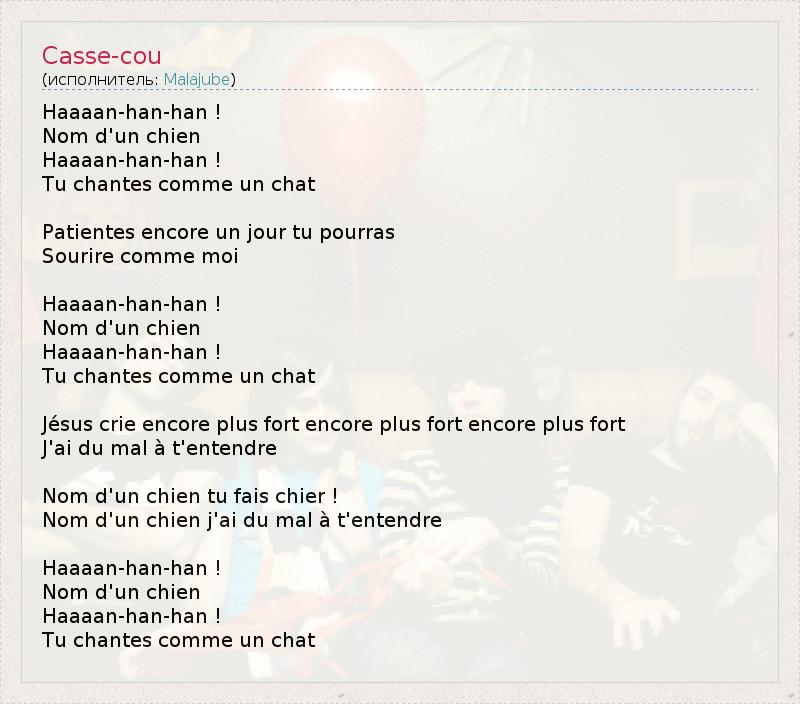 Haaaan -хан -хан ! Nom d' Андалузский Haaaan -хан -хан ! Ту chantes Comme ип чат Patientes бис ООН Jour Ту pourras Sourire Comme Moi Haaaan -хан -хан ! Nom d' Андалузский Haaaan -хан -хан ! Ту chantes Comme ип чат Хесус CRIE бис плюс форт бис плюс форт бис плюс форт J'ai дю мал à t'entendre Nom d' Андалузский ту Fais Шер ! Nom d' Андалузский j'ai дю мал à t'entendre Haaaan -хан -хан ! Nom d' Андалузский Haaaan -хан -хан ! Ту chantes Comme ип чат