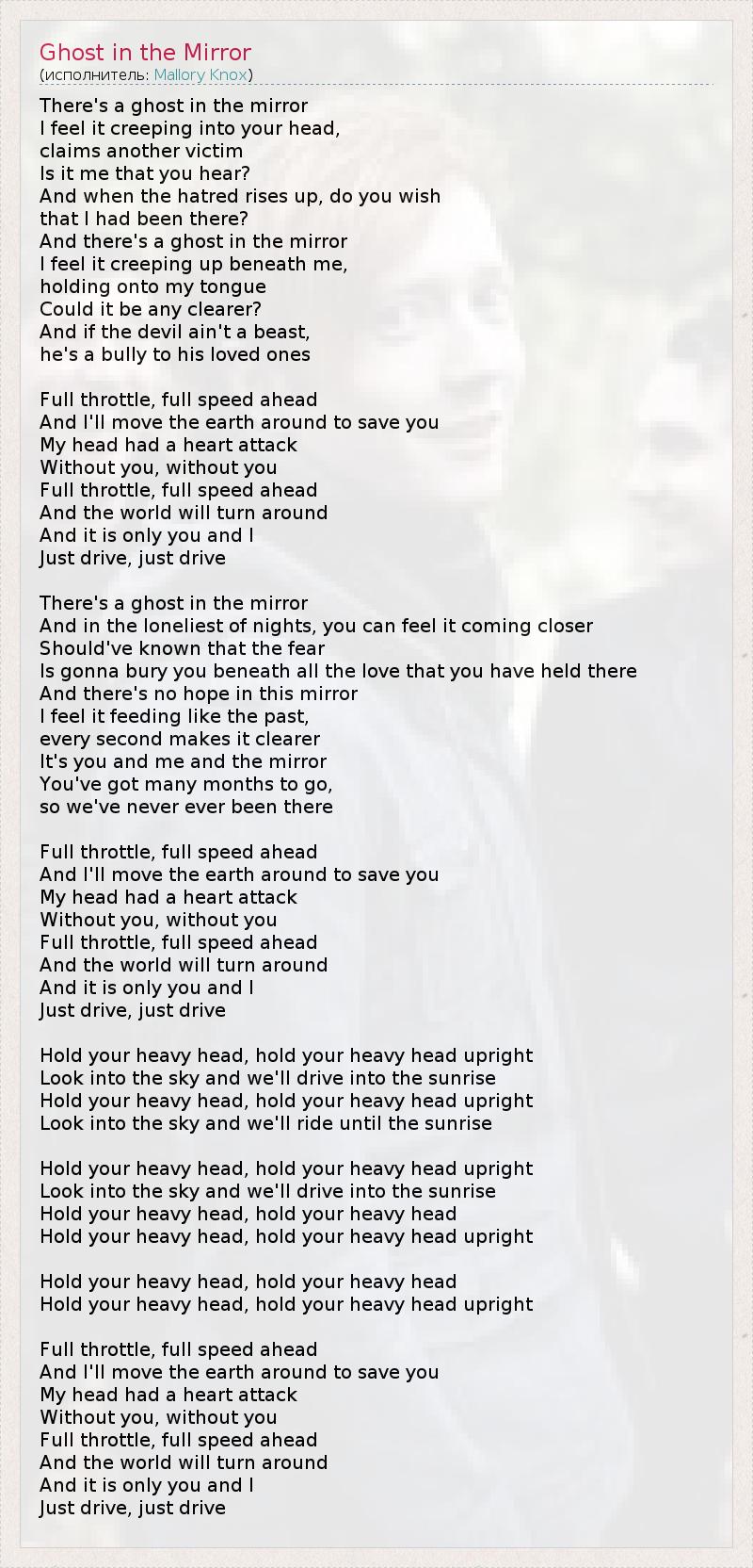 Там, в зеркале, есть призрак – Я чувствую, как он закрадывается в вашу голову, Требуя очередной жертвы. Я ли то, что ты слышишь? И когда твоя ненависть зашкаливает, желаешь ли ты, Чтобы я была там? И этот призрак в зеркале, Я чувствую, как он овладевает мной, Овладевает моим языком, Что может быть яснее? И если дьявол – не зверь, Он – обидчик своих возлюбленных. Газ в пол, полный вперёд, И я обогну всю землю, чтобы тебя спасти. У меня случился сердечный приступ 1 Без тебя, без тебя. Газ в пол, полный вперёд, И мир раскрутиться в обратную сторону, И это лишь ты и я, Просто гони, гони вперёд. Там, в зеркале, есть призрак – И самой одинокой ночью ты почувствуешь, что он всё ближе. Ты должен был знать, что страх Похоронит тебя подо всей этой любовью, что ты хранил, И там, в зеркале, нет никакой надежды. Я чувствую, как он насыщается, словно прошлое, С каждой секундой становясь всё очевиднее, Это лишь ты, я и зеркало – У тебя много месяцев впереди, чтобы уйти прочь, Так что мы там никогда в жизни не были. Газ в пол, полный вперёд, И я обогну всю землю, чтобы тебя спасти. У меня случился сердечный приступ Без тебя, без тебя. Газ в пол, полный вперёд, И мир раскрутиться в обратную сторону, И это лишь ты и я, Просто гони, гони вперёд. Не падай духом, не вешай нос, Смотри на небо, мы умчимся прямо в рассвет. Не падай духом, не вешай нос, Смотри на небо, мы будем гнать до самого рассвета. Не падай духом, не вешай нос, Смотри на небо, мы умчимся прямо в рассвет. Не падай духом, не вешай нос, Не падай духом, не вешай нос. Не падай духом, не вешай нос, Не падай духом, не вешай нос. Газ в пол, полный вперёд, И я обогну всю землю, чтобы тебя спасти. У меня случился сердечный приступ Без тебя, без тебя. Газ в пол, полный вперёд, И мир раскрутиться в обратную сторону, И это лишь ты и я, Просто гони, гони вперёд. 1 – досл.: Моя голова получила сердечный приступ.