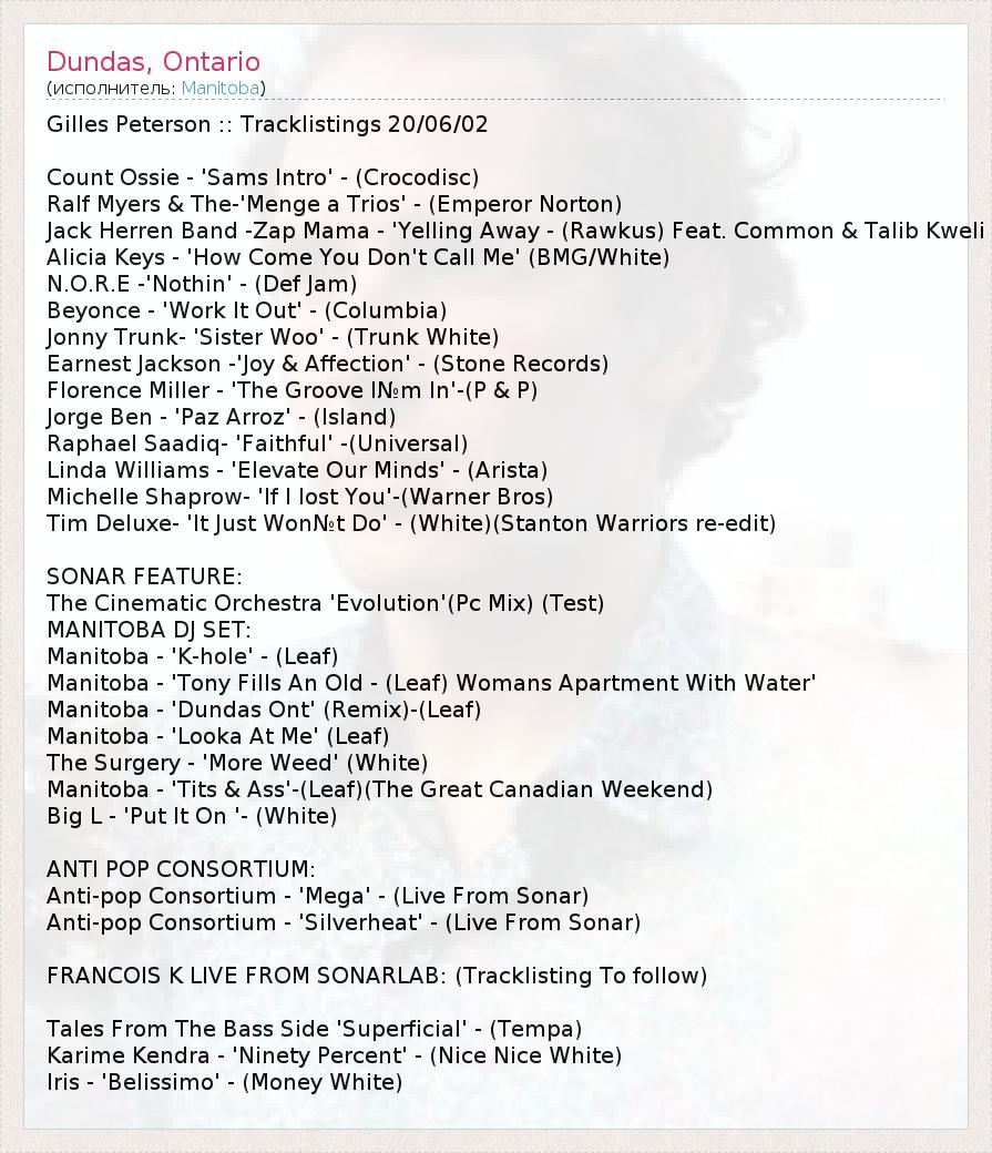 Жиль Петерсон :: Tracklistings 20/06/02 Граф Осси - "Sams Введение '- (Crocodisc) Ральф Майерс и усилитель; -'Menge Трио '- (император Нортон) Джек Herren Группа -Zap Мама - "Вопли Away - (Rawkus) Feat. Общие и усилитель; Talib Kweli Alicia Keys - "Почему ты не называй меня" (BMG / белый) N.O.R.E -'Nothin '- (Def Jam) Бейонсе - "Work It Out" - (Columbia) Джонни Trunk- 'Сестра Ву' - (магистральные белый) Убедительная Джексон -'Joy & AMP; Привязанность '- (камень Records) Флоренция Миллер - "Groove I№m В '- (Р & Amp; Р) Хорхе Бен - "Пас Arroz '- (Остров) Рафаэль Saadiq- 'Верный "- (Универсальный) Линда Уильямс - "Поднимите наши умы '- (Arista) Мишель Shaprow- "Если я потерял вас '- (Warner Bros) Тим Deluxe- "Это Просто Won№t ли '- (белый) (Stanton Warriors повторно редактировать) SONAR В ФОКУСЕ: The Cinematic Orchestra 'Эволюция' (ПК Mix) (тест) Манитоба DJ Set: Манитоба - "К-дыра» - (Лист) Манитоба - "Тони заливки Старый - (Лист) Женщины квартира с водой" Манитоба - "Дандас Онтарио" (Ремикс) - (Лист) Манитоба - "Looka At Me '(лист) Хирургия - «Больше Сорняк" (белый) Манитоба - "Сиськи и усилитель; Жопа "- (лист) (выходные Великий канадский) Big L - "Put It On" - (белый) АНТИ POP Консорциум Анти-поп Консорциум - "Мега" - (Live From Sonar) Анти-поп Консорциум - "Silverheat '- (Live From Sonar) FRANCOIS К ЖИТЬ ОТ SONARLAB: (Треклист Чтобы следовать) Сказки с бас Сиде '' Поверхностная - (Tempa) Karime Кендра - "Девяносто процентов" - (Ницца белый) Ирис - "Белиссимо" - (Деньги белый)