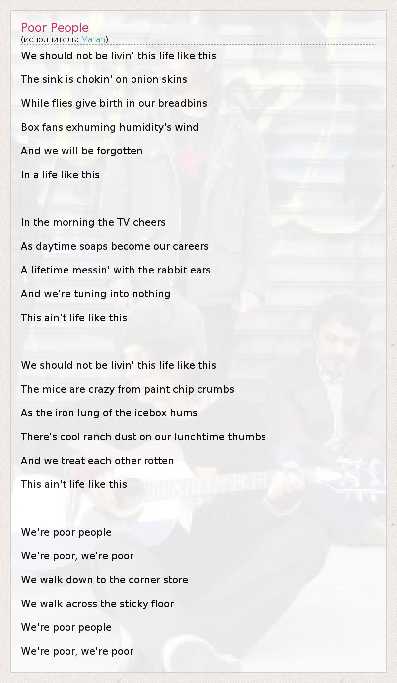 We should not be livin' this life like this The sink is chokin' on onion skins While flies give birth in our breadbins Box fans exhuming humidity's wind And we will be forgotten In a life like this In the morning the TV cheers As daytime soaps become our careers A lifetime messin' with the rabbit ears And we're tuning into nothing This ain't life like this We should not be livin' this life like this The mice are crazy from paint chip crumbs As the iron lung of the icebox hums There's cool ranch dust on our lunchtime thumbs And we treat each other rotten This ain't life like this We're poor people We're poor, we're poor We walk down to the corner store We walk across the sticky floor We're poor people We're poor, we're poor