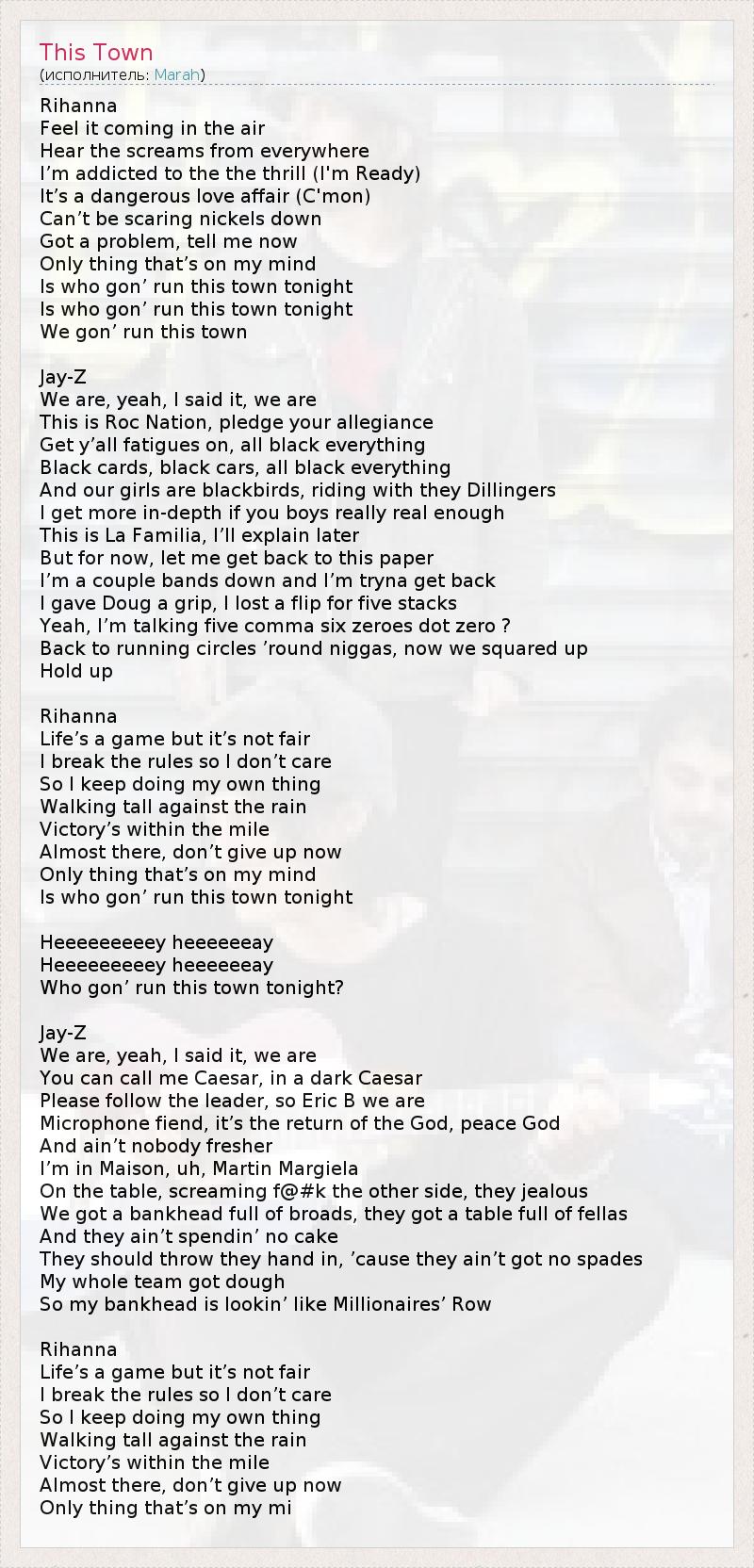 Rihanna Feel it coming in the air Hear the screams from everywhere I’m addicted to the the thrill (I'm Ready) It’s a dangerous love affair (C'mon) Can’t be scaring nickels down Got a problem, tell me now Only thing that’s on my mind Is who gon’ run this town tonight Is who gon’ run this town tonight We gon’ run this town Jay-Z We are, yeah, I said it, we are This is Roc Nation, pledge your allegiance Get y’all fatigues on, all black everything Black cards, black cars, all black everything And our girls are blackbirds, riding with they Dillingers I get more in-depth if you boys really real enough This is La Familia, I’ll explain later But for now, let me get back to this paper I’m a couple bands down and I’m tryna get back I gave Doug a grip, I lost a flip for five stacks Yeah, I’m talking five comma six zeroes dot zero ? Back to running circles ’round niggas, now we squared up Hold up Rihanna Life’s a game but it’s not fair I break the rules so I don’t care So I keep doing my own thing Walking tall against the rain Victory’s within the mile Almost there, don’t give up now Only thing that’s on my mind Is who gon’ run this town tonight Heeeeeeeeey heeeeeeay Heeeeeeeeey heeeeeeay Who gon’ run this town tonight? Jay-Z We are, yeah, I said it, we are You can call me Caesar, in a dark Caesar Please follow the leader, so Eric B we are Microphone fiend, it’s the return of the God, peace God And ain’t nobody fresher I’m in Maison, uh, Martin Margiela On the table, screaming f@#k the other side, they jealous We got a bankhead full of broads, they got a table full of fellas And they ain’t spendin’ no cake They should throw they hand in, ’cause they ain’t got no spades My whole team got dough So my bankhead is lookin’ like Millionaires’ Row Rihanna Life’s a game but it’s not fair I break the rules so I don’t care So I keep doing my own thing Walking tall against the rain Victory’s within the mile Almost there, don’t give up now Only thing that’s on my mi