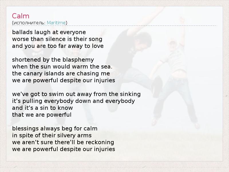 ballads laugh at everyone worse than silence is their song and you are too far away to love shortened by the blasphemy when the sun would warm the sea. the canary islands are chasing me we are powerful despite our injuries we've got to swim out away from the sinking it's pulling everybody down and everybody and it's a sin to know that we are powerful blessings always beg for calm in spite of their silvery arms we aren't sure there'll be reckoning we are powerful despite our injuries