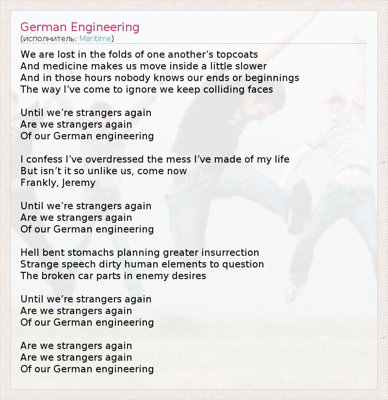 We are lost in the folds of one another’s topcoats And medicine makes us move inside a little slower And in those hours nobody knows our ends or beginnings The way I’ve come to ignore we keep colliding faces Until we’re strangers again Are we strangers again Of our German engineering I confess I’ve overdressed the mess I’ve made of my life But isn’t it so unlike us, come now Frankly, Jeremy Until we’re strangers again Are we strangers again Of our German engineering Hell bent stomachs planning greater insurrection Strange speech dirty human elements to question The broken car parts in enemy desires Until we’re strangers again Are we strangers again Of our German engineering Are we strangers again Are we strangers again Of our German engineering
