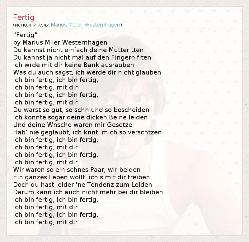 "Fertig" by Marius Mller Westernhagen Du kannst nicht einfach deine Mutter tten Du kannst ja nicht mal auf den Fingern flten Ich wrde mit dir keine Bank ausrauben Was du auch sagst, ich werde dir nicht glauben Ich bin fertig, ich bin fertig, ich bin fertig, mit dir Ich bin fertig, ich bin fertig, ich bin fertig, mit dir Du warst so gut, so schn und so bescheiden Ich konnte sogar deine dicken Beine leiden Und deine Wnsche waren mir Gesetze Hab' nie geglaubt, ich knnt' mich so verschtzen Ich bin fertig, ich bin fertig, ich bin fertig, mit dir Ich bin fertig, ich bin fertig, ich bin fertig, mit dir Wir waren so ein schnes Paar, wir beiden Ein ganzes Leben wollt' ich's mit dir treiben Doch du hast leider 'ne Tendenz zum Leiden Darum kann ich auch nicht mehr bei dir bleiben Ich bin fertig, ich bin fertig, ich bin fertig, mit dir Ich bin fertig, ich bin fertig, ich bin fertig, mit dir