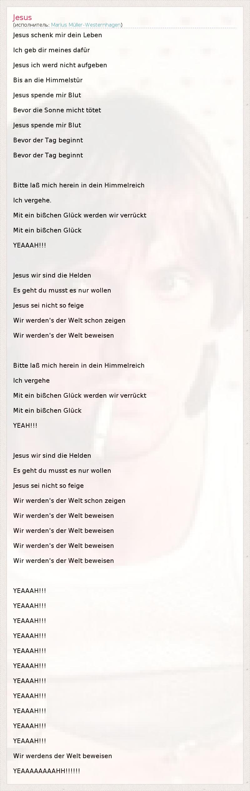 Jesus schenk mir dein Leben Ich geb dir meines dafür Jesus ich werd nicht aufgeben Bis an die Himmelstür Jesus spende mir Blut Bevor die Sonne micht tötet Jesus spende mir Blut Bevor der Tag beginnt Bevor der Tag beginnt Bitte laß mich herein in dein Himmelreich Ich vergehe. Mit ein bißchen Glück werden wir verrückt Mit ein bißchen Glück YEAAAH!!! Jesus wir sind die Helden Es geht du musst es nur wollen Jesus sei nicht so feige Wir werden's der Welt schon zeigen Wir werden's der Welt beweisen Bitte laß mich herein in dein Himmelreich Ich vergehe Mit ein bißchen Glück werden wir verrückt Mit ein bißchen Glück YEAH!!! Jesus wir sind die Helden Es geht du musst es nur wollen Jesus sei nicht so feige Wir werden's der Welt schon zeigen Wir werden's der Welt beweisen Wir werden's der Welt beweisen Wir werden's der Welt beweisen Wir werden's der Welt beweisen YEAAAH!!! YEAAAH!!! YEAAAH!!! YEAAAH!!! YEAAAH!!! YEAAAH!!! YEAAAH!!! YEAAAH!!! YEAAAH!!! YEAAAH!!! YEAAAH!!! Wir werdens der Welt beweisen YEAAAAAAAAHH!!!!!!