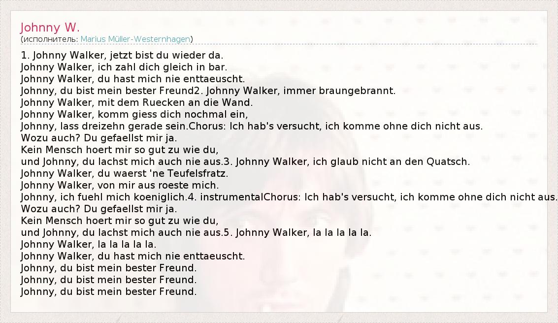 1. Johnny Walker, jetzt bist du wieder da. Johnny Walker, ich zahl dich gleich in bar. Johnny Walker, du hast mich nie enttaeuscht. Johnny, du bist mein bester Freund2. Johnny Walker, immer braungebrannt. Johnny Walker, mit dem Ruecken an die Wand. Johnny Walker, komm giess dich nochmal ein, Johnny, lass dreizehn gerade sein.Chorus: Ich hab's versucht, ich komme ohne dich nicht aus. Wozu auch? Du gefaellst mir ja. Kein Mensch hoert mir so gut zu wie du, und Johnny, du lachst mich auch nie aus.3. Johnny Walker, ich glaub nicht an den Quatsch. Johnny Walker, du waerst 'ne Teufelsfratz. Johnny Walker, von mir aus roeste mich. Johnny, ich fuehl mich koeniglich.4. instrumentalChorus: Ich hab's versucht, ich komme ohne dich nicht aus. Wozu auch? Du gefaellst mir ja. Kein Mensch hoert mir so gut zu wie du, und Johnny, du lachst mich auch nie aus.5. Johnny Walker, la la la la la. Johnny Walker, la la la la la. Johnny Walker, du hast mich nie enttaeuscht. Johnny, du bist mein bester Freund. Johnny, du bist mein bester Freund. Johnny, du bist mein bester Freund.