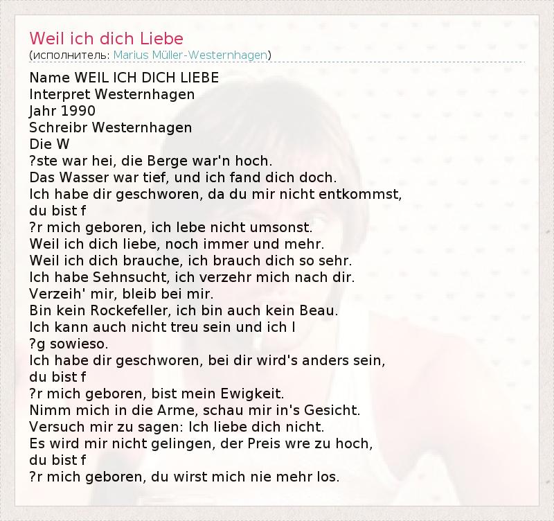 Name WEIL ICH DICH LIEBE Interpret Westernhagen Jahr 1990 Schreibr Westernhagen Die W ?ste war hei, die Berge war'n hoch. Das Wasser war tief, und ich fand dich doch. Ich habe dir geschworen, da du mir nicht entkommst, du bist f ?r mich geboren, ich lebe nicht umsonst. Weil ich dich liebe, noch immer und mehr. Weil ich dich brauche, ich brauch dich so sehr. Ich habe Sehnsucht, ich verzehr mich nach dir. Verzeih' mir, bleib bei mir. Bin kein Rockefeller, ich bin auch kein Beau. Ich kann auch nicht treu sein und ich l ?g sowieso. Ich habe dir geschworen, bei dir wird's anders sein, du bist f ?r mich geboren, bist mein Ewigkeit. Nimm mich in die Arme, schau mir in's Gesicht. Versuch mir zu sagen: Ich liebe dich nicht. Es wird mir nicht gelingen, der Preis wre zu hoch, du bist f ?r mich geboren, du wirst mich nie mehr los.