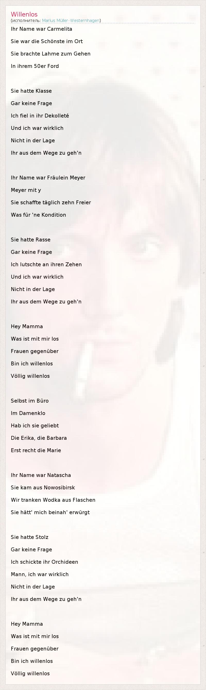 Ihr Name war Carmelita Sie war die Schönste im Ort Sie brachte Lahme zum Gehen In ihrem 50er Ford Sie hatte Klasse Gar keine Frage Ich fiel in ihr Dekolleté Und ich war wirklich Nicht in der Lage Ihr aus dem Wege zu geh'n Ihr Name war Fräulein Meyer Meyer mit y Sie schaffte täglich zehn Freier Was für 'ne Kondition Sie hatte Rasse Gar keine Frage Ich lutschte an ihren Zehen Und ich war wirklich Nicht in der Lage Ihr aus dem Wege zu geh'n Hey Mamma Was ist mit mir los Frauen gegenüber Bin ich willenlos Völlig willenlos Selbst im Büro Im Damenklo Hab ich sie geliebt Die Erika, die Barbara Erst recht die Marie Ihr Name war Natascha Sie kam aus Nowosibirsk Wir tranken Wodka aus Flaschen Sie hätt' mich beinah' erwürgt Sie hatte Stolz Gar keine Frage Ich schickte ihr Orchideen Mann, ich war wirklich Nicht in der Lage Ihr aus dem Wege zu geh'n Hey Mamma Was ist mit mir los Frauen gegenüber Bin ich willenlos Völlig willenlos