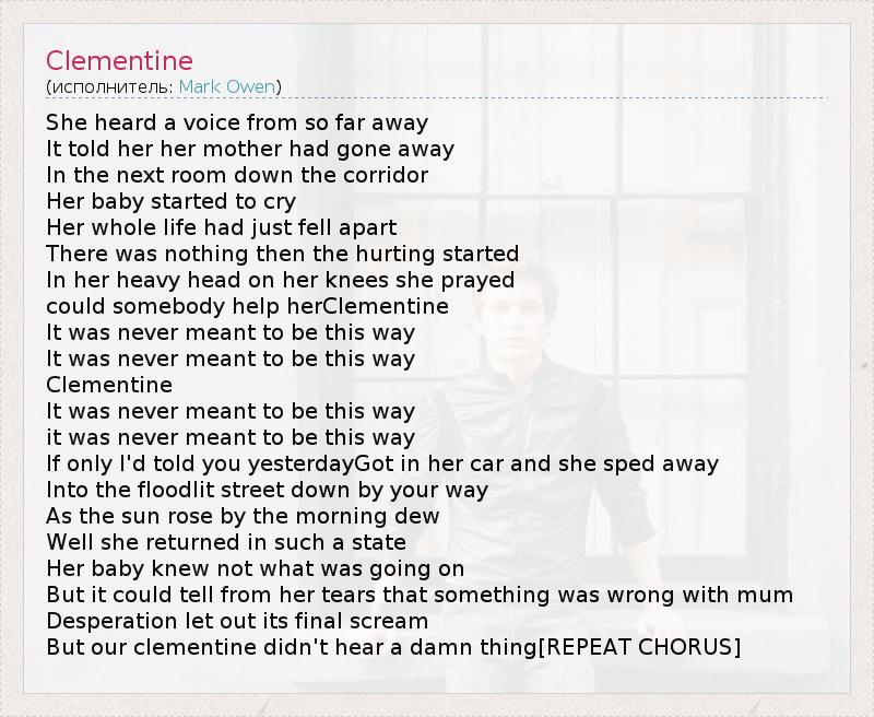 She heard a voice from so far away It told her her mother had gone away In the next room down the corridor Her baby started to cry Her whole life had just fell apart There was nothing then the hurting started In her heavy head on her knees she prayed could somebody help herClementine It was never meant to be this way It was never meant to be this way Clementine It was never meant to be this way it was never meant to be this way If only I'd told you yesterdayGot in her car and she sped away Into the floodlit street down by your way As the sun rose by the morning dew Well she returned in such a state Her baby knew not what was going on But it could tell from her tears that something was wrong with mum Desperation let out its final scream But our clementine didn't hear a damn thing[REPEAT CHORUS]