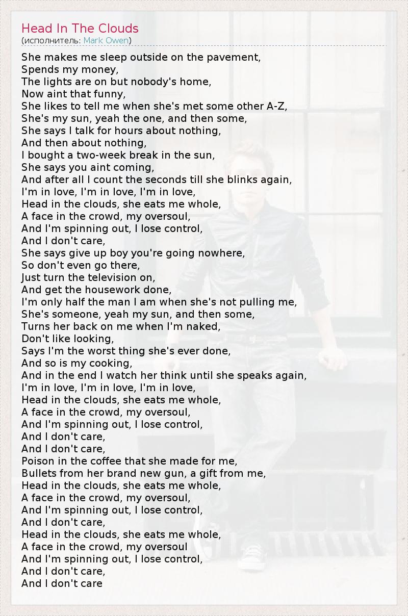 She makes me sleep outside on the pavement, Spends my money, The lights are on but nobody's home, Now aint that funny, She likes to tell me when she's met some other A-Z, She's my sun, yeah the one, and then some, She says I talk for hours about nothing, And then about nothing, I bought a two-week break in the sun, She says you aint coming, And after all I count the seconds till she blinks again, I'm in love, I'm in love, I'm in love, Head in the clouds, she eats me whole, A face in the crowd, my oversoul, And I'm spinning out, I lose control, And I don't care, She says give up boy you're going nowhere, So don't even go there, Just turn the television on, And get the housework done, I'm only half the man I am when she's not pulling me, She's someone, yeah my sun, and then some, Turns her back on me when I'm naked, Don't like looking, Says I'm the worst thing she's ever done, And so is my cooking, And in the end I watch her think until she speaks again, I'm in love, I'm in love, I'm in love, Head in the clouds, she eats me whole, A face in the crowd, my oversoul, And I'm spinning out, I lose control, And I don't care, And I don't care, Poison in the coffee that she made for me, Bullets from her brand new gun, a gift from me, Head in the clouds, she eats me whole, A face in the crowd, my oversoul, And I'm spinning out, I lose control, And I don't care, Head in the clouds, she eats me whole, A face in the crowd, my oversoul And I'm spinning out, I lose control, And I don't care, And I don't care