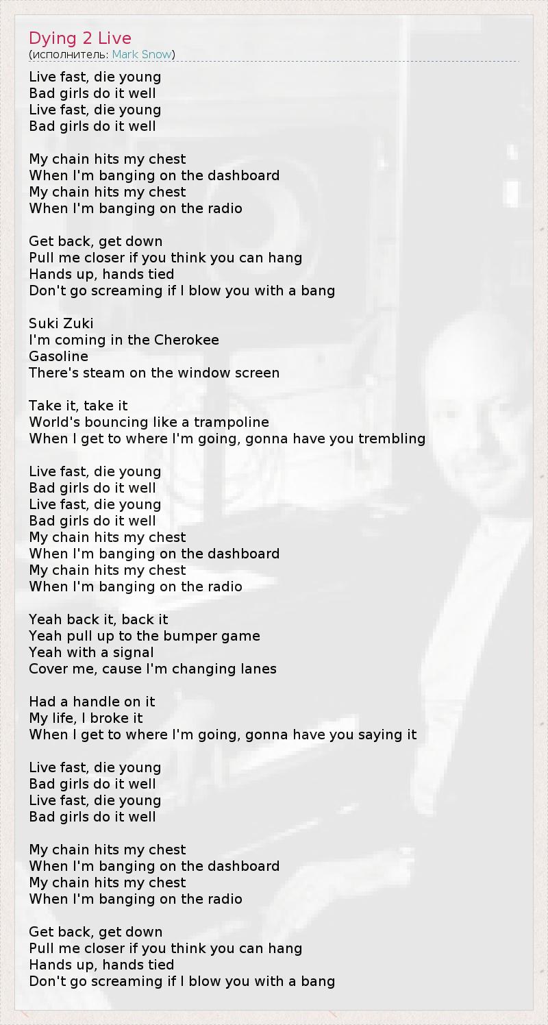 Живи быстро, умри молодым, У плохих девочек это хорошо получается. Живи быстро, умри молодым, У плохих девочек это хорошо получается. Моя цепочка бьется мне о грудь, Когда я ударяю по приборной панели. Моя цепочка бьется мне о грудь, Когда я включаю радио. Вернись, пригнись, Притяни меня ближе к себе, если думаешь, что сможешь справиться. Подними руки вверх, руки связаны, Не начинай орать, если я в тебя въеду. Ресторан "Суки Зуки", Я приеду на джипе "Чероки". Бензин, Пар на стекле. Не падай духом, не падай духом, Жизнь то взлетает, то падает, как на батуте. Когда я доберусь туда, куда направляюсь, я заставлю тебя дрожать от страха. Живи быстро, умри молодым, У плохих девочек это хорошо получается. Живи быстро, умри молодым, У плохих девочек это хорошо получается. Моя цепочка бьется мне о грудь, Когда я ударяю по приборной панели. Моя цепочка бьется мне о грудь, Когда я включаю радио. Да, задний ход, задний ход. Да, притормози, поиграем с бампером. 1 Да, посигналим. Прикрой меня, потому что я перестраиваюсь в другой ряд. Я контролировала ситуацию. Моя жизнь, я ее разрушила. Когда я доберусь туда, куда направляюсь, я заставлю тебя это сказать. Живи быстро, умри молодым, У плохих девочек это хорошо получается. Живи быстро, умри молодым, У плохих девочек это хорошо получается. Моя цепочка бьется мне о грудь, Когда я ударяю по приборной панели. Моя цепочка бьется мне о грудь, Когда я включаю радио. Вернись, пригнись, Притяни меня ближе к себе, если думаешь, что сможешь справиться. Подними руки вверх, руки связаны, Не начинай орать, если я в тебя въеду. 1 - имеется в виду: идти впритык к другим автомобилям, не соблюдать дистанцию