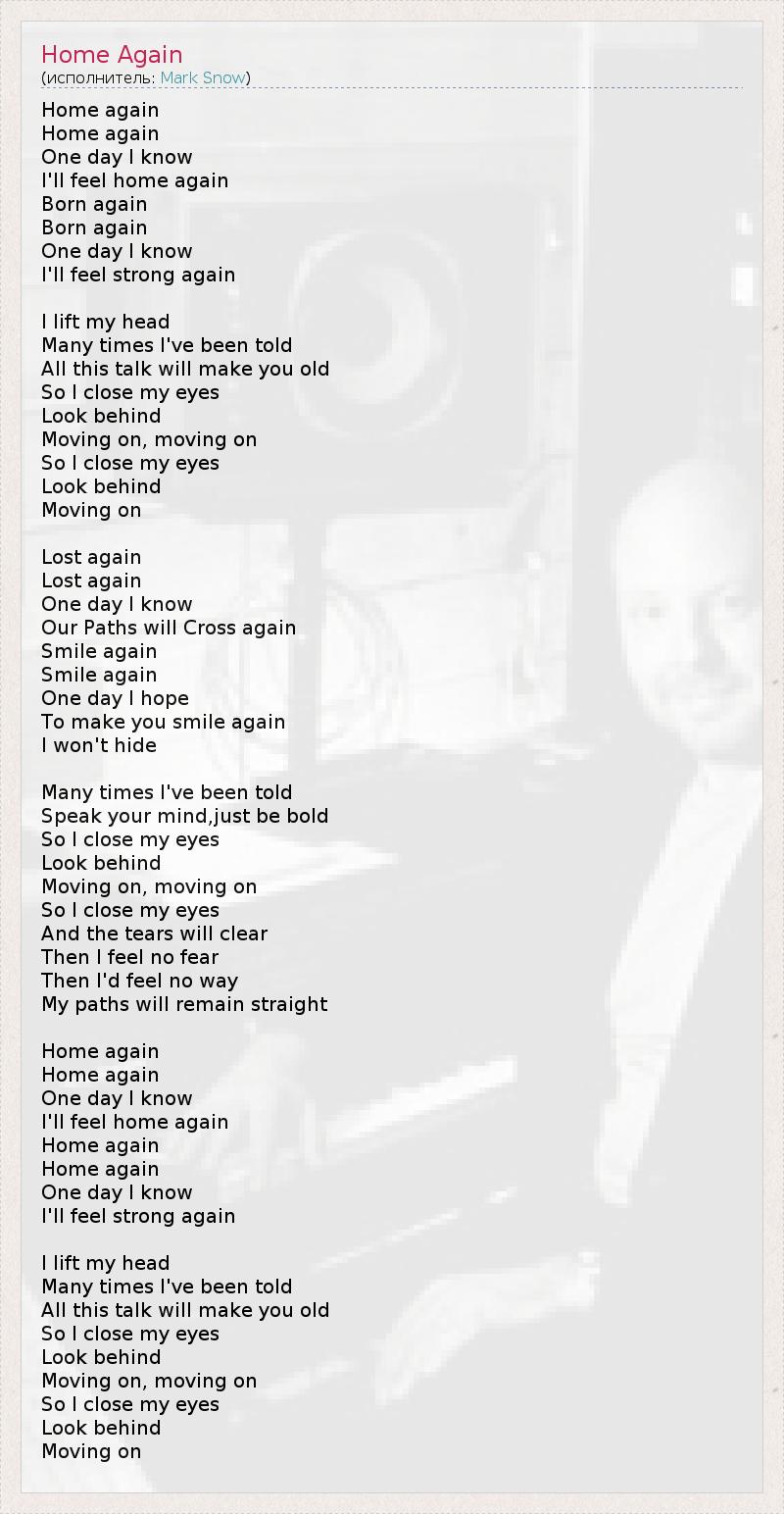 Снова дома, Снова дома, Я знаю, однажды Я вновь почувствую себя, как дома. Возрожденным, Возрожденным, Я знаю, однажды Я вновь почувствую себя сильным. Я поднимаю голову. Мне говорили много раз: "Все эти разговоры состарят тебя." Так что я закрываю глаза, Оглядываюсь назад, Продолжая двигаться дальше, продолжая двигаться дальше. Так что я закрываю глаза, Оглядываюсь назад, Продолжая двигаться дальше. Снова потерялся, Снова сбился с пути. Я знаю, однажды Наши дороги пересекутся вновь. Снова улыбаюсь, Снова улыбаюсь. Я надеюсь однажды Заставить тебя улыбнуться вновь. Я не спрячусь. Мне говорили много раз: "Говори то, что думаешь, просто будь смел." Так что я закрываю глаза, Оглядываюсь назад, Продолжая двигаться дальше, продолжая двигаться дальше. Так что я закрываю глаза, И рассеются слезы, Затем я перестану бояться, Затем я почувствую, что при любых обстоятельствах Мои дороги останутся прямыми. Снова дома, Снова дома, Я знаю, однажды Я вновь почувствую себя, как дома. Возрожденным, Возрожденным, Я знаю, однажды Я вновь почувствую себя сильным. Я поднимаю голову. Мне говорили много раз: "Все эти разговоры состарят тебя." Так что я закрываю глаза, Оглядываюсь назад, Продолжая двигаться дальше, продолжая двигаться дальше. Так что я закрываю глаза, Оглядываюсь назад, Продолжая двигаться дальше.