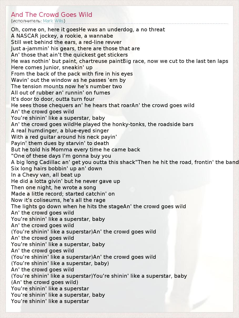 Oh, come on, here it goesHe was an underdog, a no threat A NASCAR jockey, a rookie, a wannabe Still wet behind the ears, a red-line revver Just a-jammin' his gears, there are those that are An' those that ain't the quickest get stickers He was nothin' but paint, chartreuse paintBig race, now we cut to the last ten laps Here comes Junior, sneakin' up From the back of the pack with fire in his eyes Wavin' out the window as he passes 'em by The tension mounts now he's number two All out of rubber an' runnin' on fumes It's door to door, outta turn four He sees those chequers an' he hears that roarAn' the crowd goes wild An' the crowd goes wild You're shinin' like a superstar, baby An' the crowd goes wildHe played the honky-tonks, the roadside bars A real humdinger, a blue-eyed singer With a red guitar around his neck payin' Payin' them dues by starvin' to death But he told his Momma every time he came back "One of these days I'm gonna buy you A big long Cadillac an' get you outta this shack"Then he hit the road, frontin' the band Six long hairs bobbin' up an' down In a Chevy van, all beat up He did a lotta givin' but he never gave up Then one night, he wrote a song Made a little record; started catchin' on Now it's coliseums, he's all the rage The lights go down when he hits the stageAn' the crowd goes wild An' the crowd goes wild You're shinin' like a superstar, baby An' the crowd goes wild (You're shinin' like a superstar)An' the crowd goes wild An' the crowd goes wild You're shinin' like a superstar, baby An' the crowd goes wild (You're shinin' like a superstar)An' the crowd goes wild (You're shinin' like a superstar, baby) An' the crowd goes wild (You're shinin' like a superstar)You're shinin' like a superstar, baby (An' the crowd goes wild) You're shinin' like a superstar You're shinin' like a superstar, baby You're shinin' like a superstar