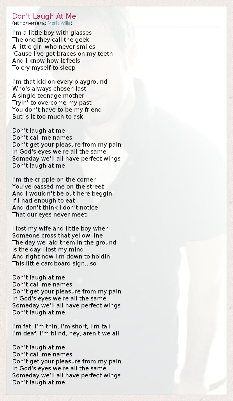 I'm a little boy with glasses The one they call the geek A little girl who never smiles 'Cause I've got braces on my teeth And I know how it feels To cry myself to sleep I'm that kid on every playground Who's always chosen last A single teenage mother Tryin' to overcome my past You don't have to be my friend But is it too much to ask Don't laugh at me Don't call me names Don't get your pleasure from my pain In God's eyes we're all the same Someday we'll all have perfect wings Don't laugh at me I'm the cripple on the corner You've passed me on the street And I wouldn't be out here beggin' If I had enough to eat And don't think I don't notice That our eyes never meet I lost my wife and little boy when Someone cross that yellow line The day we laid them in the ground Is the day I lost my mind And right now I'm down to holdin' This little cardboard sign...so Don't laugh at me Don't call me names Don't get your pleasure from my pain In God's eyes we're all the same Someday we'll all have perfect wings Don't laugh at me I'm fat, I'm thin, I'm short, I'm tall I'm deaf, I'm blind, hey, aren't we all Don't laugh at me Don't call me names Don't get your pleasure from my pain In God's eyes we're all the same Someday we'll all have perfect wings Don't laugh at me