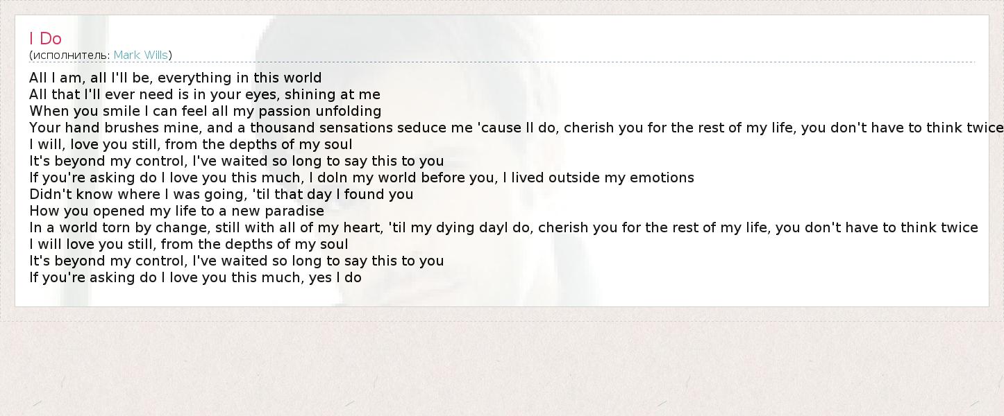 All I am, all I'll be, everything in this world All that I'll ever need is in your eyes, shining at me When you smile I can feel all my passion unfolding Your hand brushes mine, and a thousand sensations seduce me 'cause II do, cherish you for the rest of my life, you don't have to think twice I will, love you still, from the depths of my soul It's beyond my control, I've waited so long to say this to you If you're asking do I love you this much, I doIn my world before you, I lived outside my emotions Didn't know where I was going, 'til that day I found you How you opened my life to a new paradise In a world torn by change, still with all of my heart, 'til my dying dayI do, cherish you for the rest of my life, you don't have to think twice I will love you still, from the depths of my soul It's beyond my control, I've waited so long to say this to you If you're asking do I love you this much, yes I do