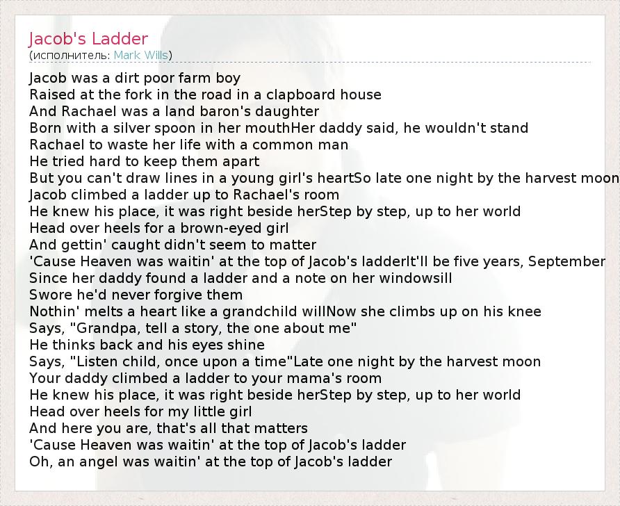 Jacob was a dirt poor farm boy Raised at the fork in the road in a clapboard house And Rachael was a land baron's daughter Born with a silver spoon in her mouthHer daddy said, he wouldn't stand Rachael to waste her life with a common man He tried hard to keep them apart But you can't draw lines in a young girl's heartSo late one night by the harvest moon Jacob climbed a ladder up to Rachael's room He knew his place, it was right beside herStep by step, up to her world Head over heels for a brown-eyed girl And gettin' caught didn't seem to matter 'Cause Heaven was waitin' at the top of Jacob's ladderIt'll be five years, September Since her daddy found a ladder and a note on her windowsill Swore he'd never forgive them Nothin' melts a heart like a grandchild willNow she climbs up on his knee Says, "Grandpa, tell a story, the one about me" He thinks back and his eyes shine Says, "Listen child, once upon a time"Late one night by the harvest moon Your daddy climbed a ladder to your mama's room He knew his place, it was right beside herStep by step, up to her world Head over heels for my little girl And here you are, that's all that matters 'Cause Heaven was waitin' at the top of Jacob's ladder Oh, an angel was waitin' at the top of Jacob's ladder