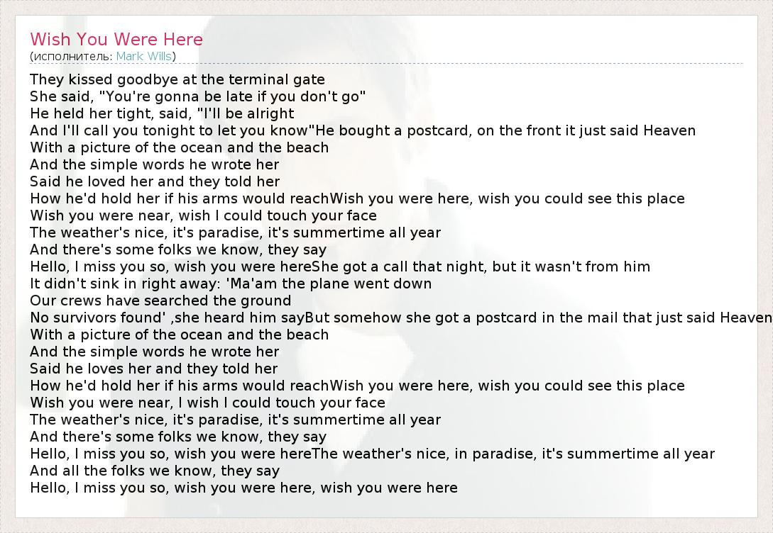 They kissed goodbye at the terminal gate She said, "You're gonna be late if you don't go" He held her tight, said, "I'll be alright And I'll call you tonight to let you know"He bought a postcard, on the front it just said Heaven With a picture of the ocean and the beach And the simple words he wrote her Said he loved her and they told her How he'd hold her if his arms would reachWish you were here, wish you could see this place Wish you were near, wish I could touch your face The weather's nice, it's paradise, it's summertime all year And there's some folks we know, they say Hello, I miss you so, wish you were hereShe got a call that night, but it wasn't from him It didn't sink in right away: 'Ma'am the plane went down Our crews have searched the ground No survivors found' ,she heard him sayBut somehow she got a postcard in the mail that just said Heaven With a picture of the ocean and the beach And the simple words he wrote her Said he loves her and they told her How he'd hold her if his arms would reachWish you were here, wish you could see this place Wish you were near, I wish I could touch your face The weather's nice, it's paradise, it's summertime all year And there's some folks we know, they say Hello, I miss you so, wish you were hereThe weather's nice, in paradise, it's summertime all year And all the folks we know, they say Hello, I miss you so, wish you were here, wish you were here