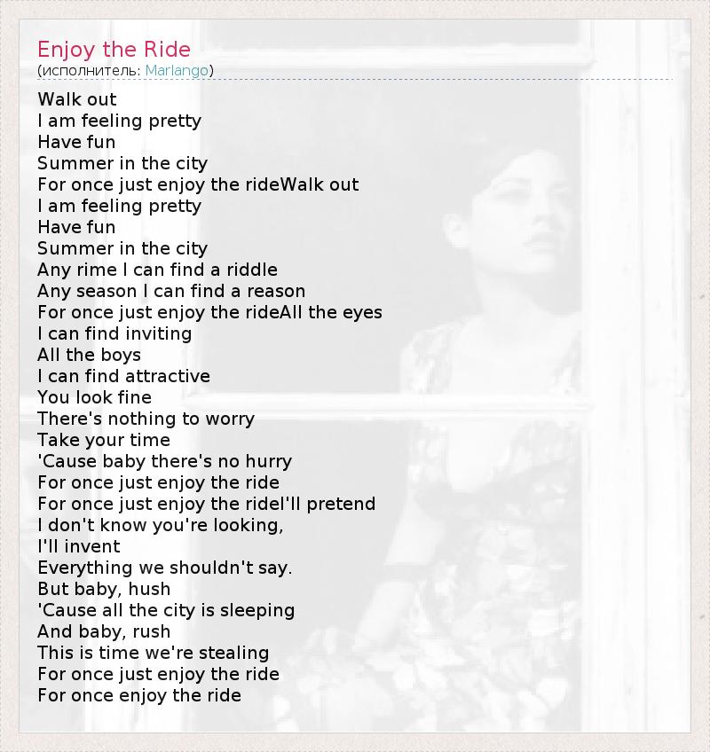 Walk out I am feeling pretty Have fun Summer in the city For once just enjoy the rideWalk out I am feeling pretty Have fun Summer in the city Any rime I can find a riddle Any season I can find a reason For once just enjoy the rideAll the eyes I can find inviting All the boys I can find attractive You look fine There's nothing to worry Take your time 'Cause baby there's no hurry For once just enjoy the ride For once just enjoy the rideI'll pretend I don't know you're looking, I'll invent Everything we shouldn't say. But baby, hush 'Cause all the city is sleeping And baby, rush This is time we're stealing For once just enjoy the ride For once enjoy the ride