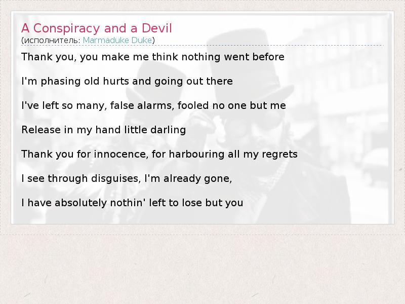 А как ты думаешь, о чем песня "A Conspiracy and a Devil" ?