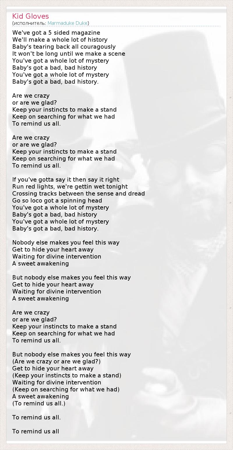 We've got a 5 sided magazine We'll make a whole lot of history Baby's tearing back all couragously It won't be long until we make a scene You've got a whole lot of mystery Baby's got a bad, bad history You've got a whole lot of mystery Baby's got a bad, bad history. Are we crazy or are we glad? Keep your instincts to make a stand Keep on searching for what we had To remind us all. Are we crazy or are we glad? Keep your instincts to make a stand Keep on searching for what we had To remind us all. If you've gotta say it then say it right Run red lights, we're gettin wet tonight Crossing tracks between the sense and dread Go so loco got a spinning head You've got a whole lot of mystery Baby's got a bad, bad history You've got a whole lot of mystery Baby's got a bad, bad history. Nobody else makes you feel this way Get to hide your heart away Waiting for divine intervention A sweet awakening But nobody else makes you feel this way Get to hide your heart away Waiting for divine intervention A sweet awakening Are we crazy or are we glad? Keep your instincts to make a stand Keep on searching for what we had To remind us all. But nobody else makes you feel this way (Are we crazy or are we glad?) Get to hide your heart away (Keep your instincts to make a stand) Waiting for divine intervention (Keep on searching for what we had) A sweet awakening (To remind us all.) To remind us all. To remind us all