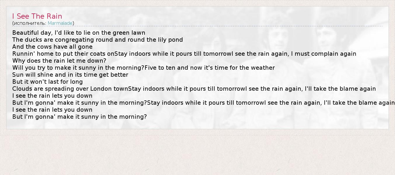 Beautiful day, I'd like to lie on the green lawn The ducks are congregating round and round the lily pond And the cows have all gone Runnin' home to put their coats onStay indoors while it pours till tomorrowI see the rain again, I must complain again Why does the rain let me down? Will you try to make it sunny in the morning?Five to ten and now it's time for the weather Sun will shine and in its time get better But it won't last for long Clouds are spreading over London townStay indoors while it pours till tomorrowI see the rain again, I'll take the blame again I see the rain lets you down But I'm gonna' make it sunny in the morning?Stay indoors while it pours till tomorrowI see the rain again, I'll take the blame again I see the rain lets you down But I'm gonna' make it sunny in the morning?
