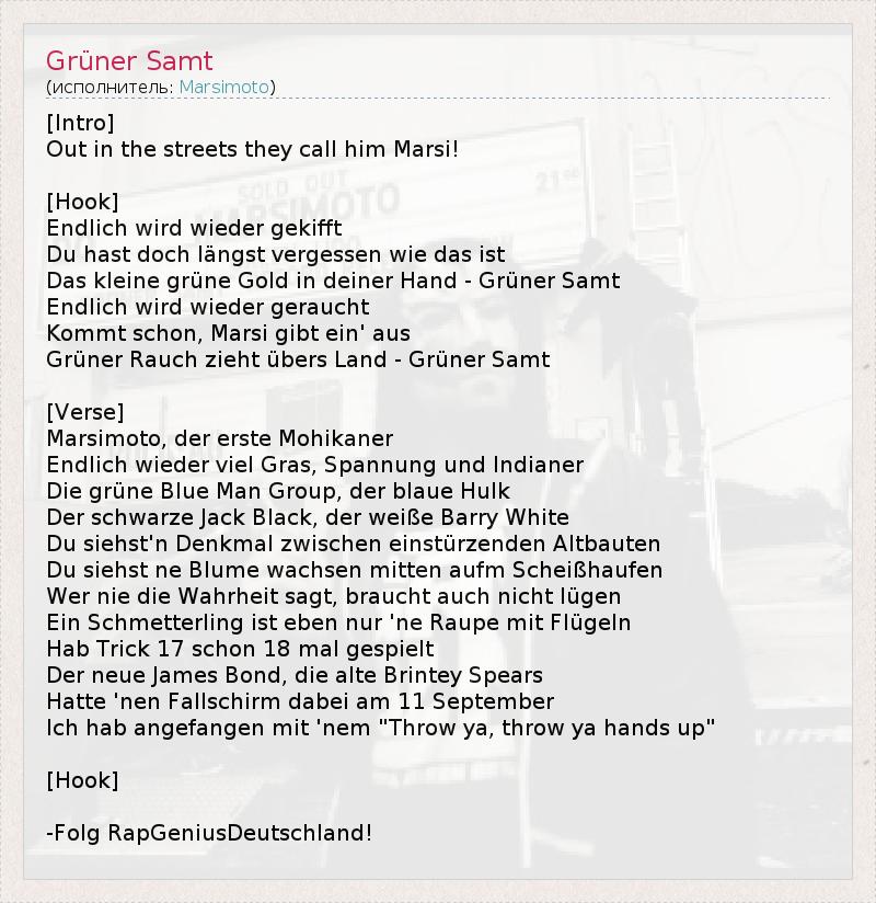 [Intro] Out in the streets they call him Marsi! [Hook] Endlich wird wieder gekifft Du hast doch längst vergessen wie das ist Das kleine grüne Gold in deiner Hand - Grüner Samt Endlich wird wieder geraucht Kommt schon, Marsi gibt ein' aus Grüner Rauch zieht übers Land - Grüner Samt [Verse] Marsimoto, der erste Mohikaner Endlich wieder viel Gras, Spannung und Indianer Die grüne Blue Man Group, der blaue Hulk Der schwarze Jack Black, der weiße Barry White Du siehst'n Denkmal zwischen einstürzenden Altbauten Du siehst ne Blume wachsen mitten aufm Scheißhaufen Wer nie die Wahrheit sagt, braucht auch nicht lügen Ein Schmetterling ist eben nur 'ne Raupe mit Flügeln Hab Trick 17 schon 18 mal gespielt Der neue James Bond, die alte Brintey Spears Hatte 'nen Fallschirm dabei am 11 September Ich hab angefangen mit 'nem "Throw ya, throw ya hands up" [Hook] -Folg RapGeniusDeutschland!
