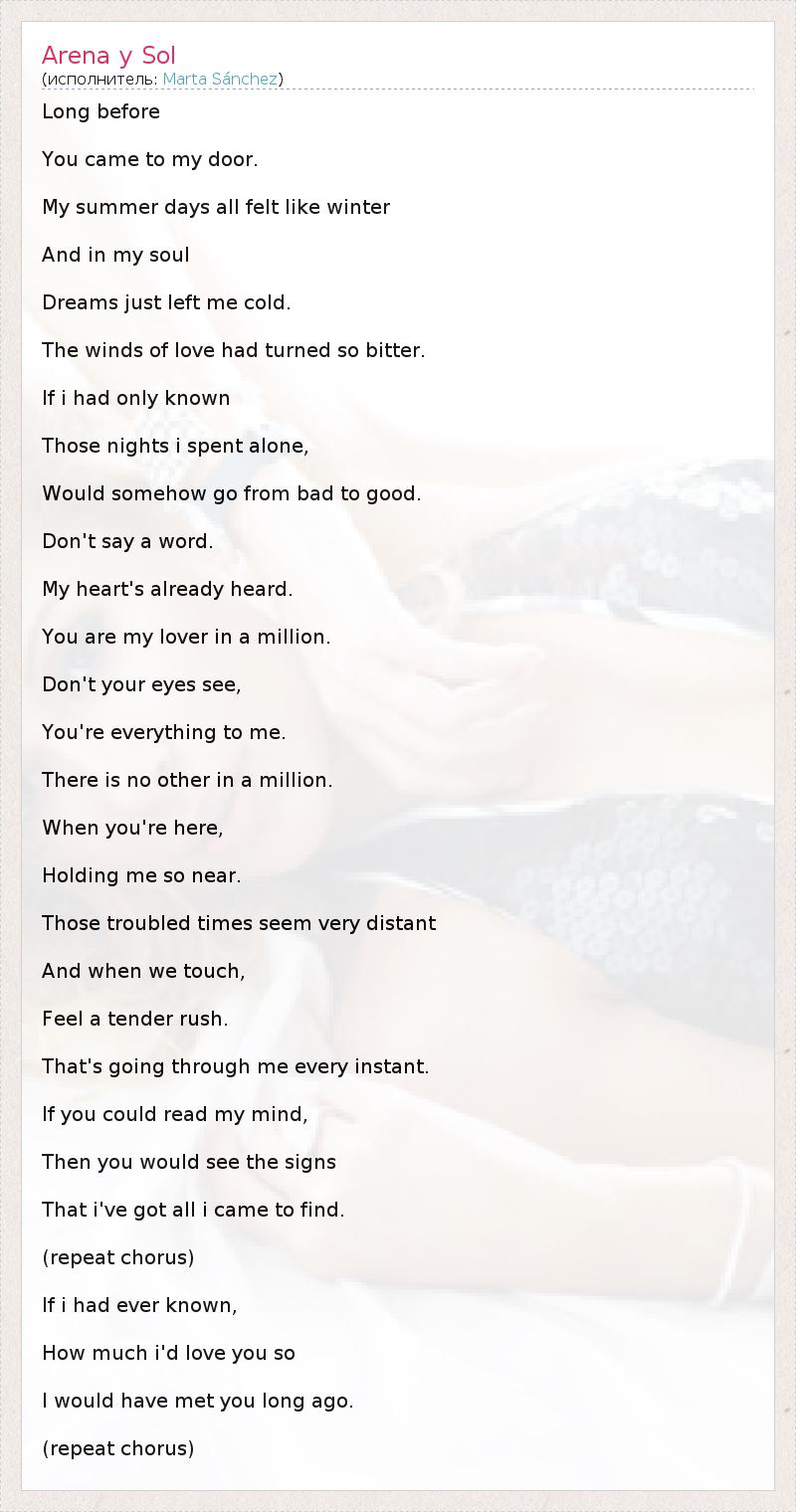Long before You came to my door. My summer days all felt like winter And in my soul Dreams just left me cold. The winds of love had turned so bitter. If i had only known Those nights i spent alone, Would somehow go from bad to good. Don't say a word. My heart's already heard. You are my lover in a million. Don't your eyes see, You're everything to me. There is no other in a million. When you're here, Holding me so near. Those troubled times seem very distant And when we touch, Feel a tender rush. That's going through me every instant. If you could read my mind, Then you would see the signs That i've got all i came to find. (repeat chorus) If i had ever known, How much i'd love you so I would have met you long ago. (repeat chorus)