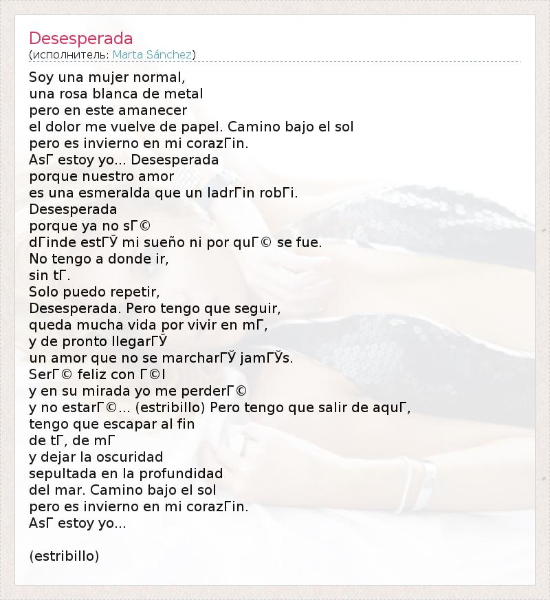 Soy una mujer normal, una rosa blanca de metal pero en este amanecer el dolor me vuelve de papel. Camino bajo el sol pero es invierno en mi corazГіn. AsГ estoy yo... Desesperada porque nuestro amor es una esmeralda que un ladrГіn robГі. Desesperada porque ya no sГ© dГіnde estГЎ mi sueño ni por quГ© se fue. No tengo a donde ir, sin tГ. Solo puedo repetir, Desesperada. Pero tengo que seguir, queda mucha vida por vivir en mГ, y de pronto llegarГЎ un amor que no se marcharГЎ jamГЎs. SerГ© feliz con Г©l y en su mirada yo me perderГ© y no estarГ©... (estribillo) Pero tengo que salir de aquГ, tengo que escapar al fin de tГ, de mГ y dejar la oscuridad sepultada en la profundidad del mar. Camino bajo el sol pero es invierno en mi corazГіn. AsГ estoy yo... (estribillo)
