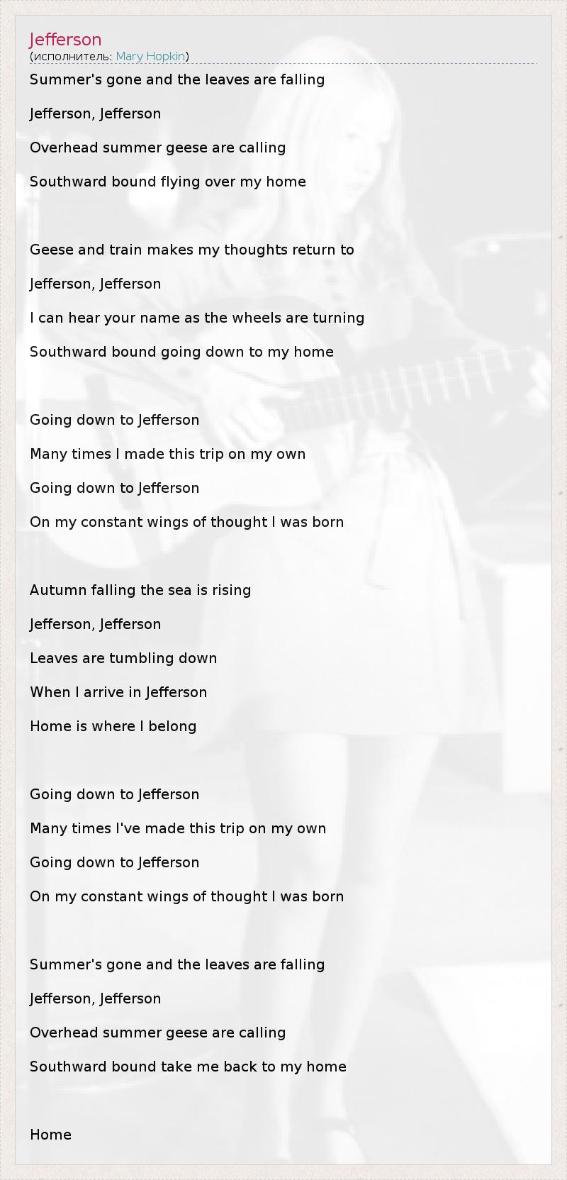 Summer's gone and the leaves are falling Jefferson, Jefferson Overhead summer geese are calling Southward bound flying over my home Geese and train makes my thoughts return to Jefferson, Jefferson I can hear your name as the wheels are turning Southward bound going down to my home Going down to Jefferson Many times I made this trip on my own Going down to Jefferson On my constant wings of thought I was born Autumn falling the sea is rising Jefferson, Jefferson Leaves are tumbling down When I arrive in Jefferson Home is where I belong Going down to Jefferson Many times I've made this trip on my own Going down to Jefferson On my constant wings of thought I was born Summer's gone and the leaves are falling Jefferson, Jefferson Overhead summer geese are calling Southward bound take me back to my home Home
