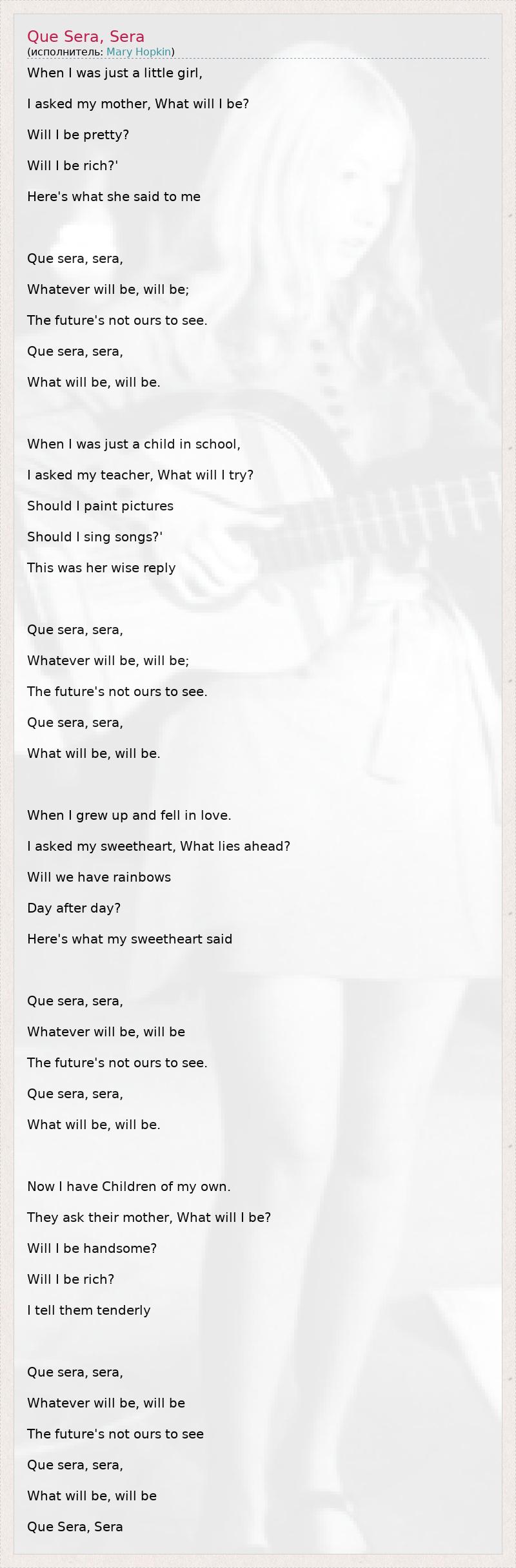 А как ты думаешь, о чем песня "Que Sera, Sera" ?