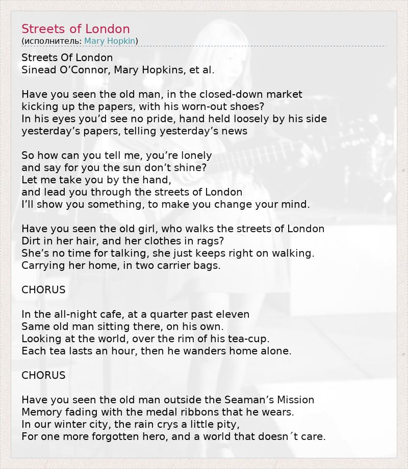 Streets Of London Sinead O’Connor, Mary Hopkins, et al. Have you seen the old man, in the closed-down market kicking up the papers, with his worn-out shoes? In his eyes you’d see no pride, hand held loosely by his side yesterday’s papers, telling yesterday’s news So how can you tell me, you’re lonely and say for you the sun don’t shine? Let me take you by the hand, and lead you through the streets of London I’ll show you something, to make you change your mind. Have you seen the old girl, who walks the streets of London Dirt in her hair, and her clothes in rags? She’s no time for talking, she just keeps right on walking. Carrying her home, in two carrier bags. CHORUS In the all-night cafe, at a quarter past eleven Same old man sitting there, on his own. Looking at the world, over the rim of his tea-cup. Each tea lasts an hour, then he wanders home alone. CHORUS Have you seen the old man outside the Seaman’s Mission Memory fading with the medal ribbons that he wears. In our winter city, the rain crys a little pity, For one more forgotten hero, and a world that doesn´t care.