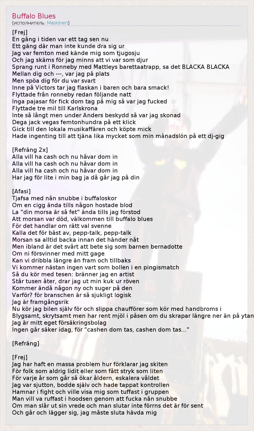 [Frej] En gång i tiden var ett tag sen nu Ett gäng där man inte kunde dra sig ur Jag var femton med kände mig som tjugosju Och jag skäms för jag minns att vi var som djur Sprang runt i Ronneby med Mattleys barettaatrapp, sa det BLACKA BLACKA Mellan dig och ---, var jag på plats Men spöa dig för du var svart Inne på Victors tar jag flaskan i baren och bara smack! Flyttade från ronneby redan följande natt Inga pajasar för fick dom tag på mig så var jag fucked Flyttade tre mil till Karlskrona Inte så långt men under Anders beskydd så var jag skonad Dega jack vegas femtonhundra på ett klick Gick till den lokala musikaffären och köpte mick Hade ingenting till att tjäna lika mycket som min månadslön på ett dj-gig [Refräng 2x] Alla vill ha cash och nu håvar dom in Alla vill ha cash och nu håvar dom in Alla vill ha cash och nu håvar dom in Har jag för lite i min bag ja då går jag på din [Afasi] Tjafsa med nån snubbe i buffaloskor Om en cigg ända tills någon hostade blod La "din morsa är så fet" ända tills jag förstod Att morsan var död, välkommen till buffalo blues För det handlar om rätt val svenne Kalla det för bäst av, pepp-talk, pepp-talk Morsan sa alltid backa innan det händer nåt Men ibland är det svårt att bete sig som barnen bernadotte Om ni försvinner med mitt gage Kan vi dribbla längre än fram och tillbaks Vi kommer nästan ingen vart som bollen i en pingismatch Så du kör med tesen: bränner jag en artist Står tusen åter, drar jag ut min kuk ur röven Kommer ändå någon ny och suger på den Varför? för branschen är så sjukligt logisk Jag är framgångsrik Nu kör jag bilen själv för och slippa chaufförer som kör med handbroms i Blygsamt, skrytsamt men har rent mjöl i påsen om du skrapar längre ner än på ytan Jag är mitt eget försäkringsbolag Ingen går säker idag, för "cashen dom tas, cashen dom tas..." [Refräng] [Frej] Jag har haft en massa problem hur förklarar jag skiten För folk som aldrig lidit eller som fått stryk som liten För varje år som går så ökar åldern, eskalera våldet Jag var sjutton, bodde själv och hade tappat kontrollen Hamnar i fight och ville visa mig som tuffast i gruppen Man vill va ruffast i hoodsen genom att fucka nån snubbe Om man slår ut sin vrede och man slutar inte förrns det är för sent Och går och lägger sig, jag måste sluta hävda mig