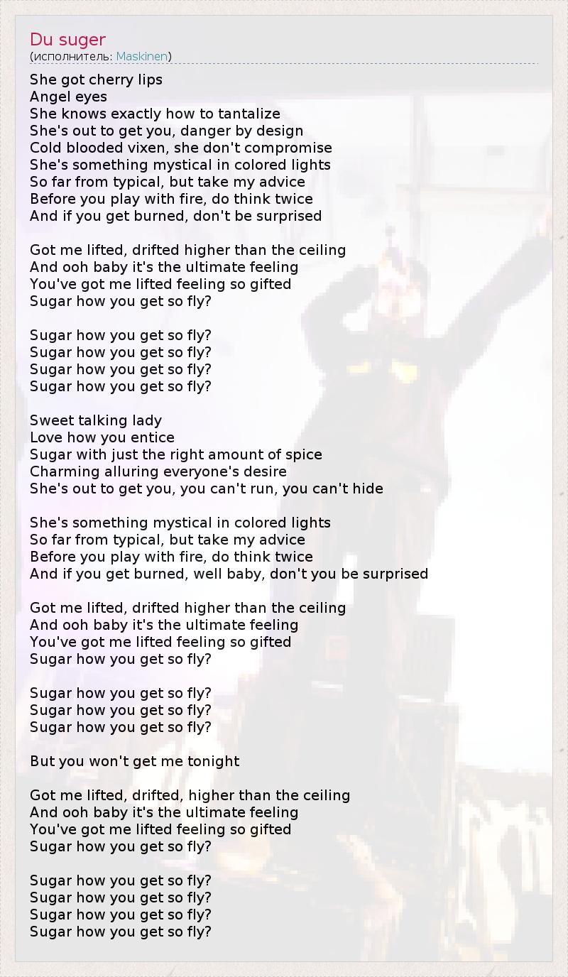 She got cherry lips Angel eyes She knows exactly how to tantalize She's out to get you, danger by design Cold blooded vixen, she don't compromise She's something mystical in colored lights So far from typical, but take my advice Before you play with fire, do think twice And if you get burned, don't be surprised Got me lifted, drifted higher than the ceiling And ooh baby it's the ultimate feeling You've got me lifted feeling so gifted Sugar how you get so fly? Sugar how you get so fly? Sugar how you get so fly? Sugar how you get so fly? Sugar how you get so fly? Sweet talking lady Love how you entice Sugar with just the right amount of spice Charming alluring everyone's desire She's out to get you, you can't run, you can't hide She's something mystical in colored lights So far from typical, but take my advice Before you play with fire, do think twice And if you get burned, well baby, don't you be surprised Got me lifted, drifted higher than the ceiling And ooh baby it's the ultimate feeling You've got me lifted feeling so gifted Sugar how you get so fly? Sugar how you get so fly? Sugar how you get so fly? Sugar how you get so fly? But you won't get me tonight Got me lifted, drifted, higher than the ceiling And ooh baby it's the ultimate feeling You've got me lifted feeling so gifted Sugar how you get so fly? Sugar how you get so fly? Sugar how you get so fly? Sugar how you get so fly? Sugar how you get so fly?