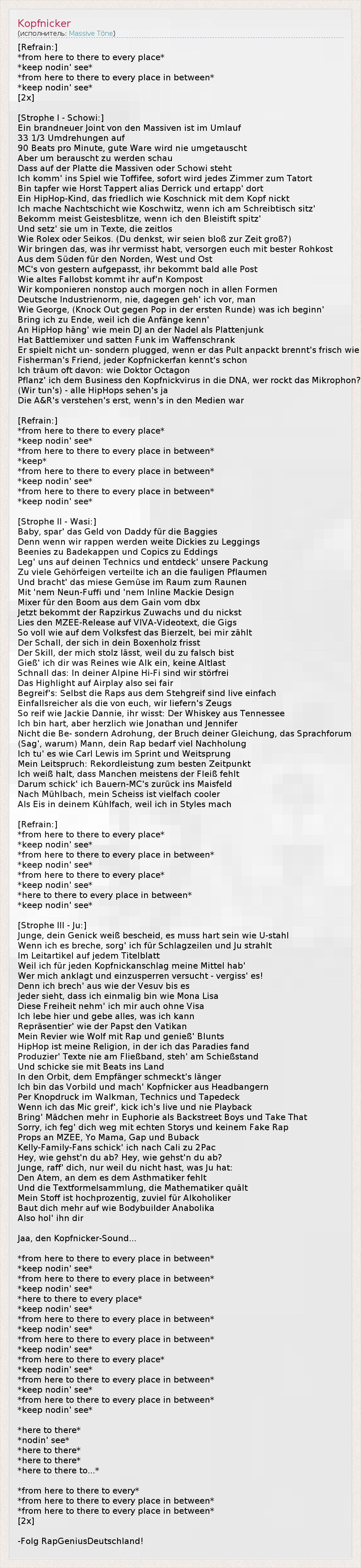 [Refrain:] *from here to there to every place* *keep nodin' see* *from here to there to every place in between* *keep nodin' see* [2x] [Strophe I - Schowi:] Ein brandneuer Joint von den Massiven ist im Umlauf 33 1/3 Umdrehungen auf 90 Beats pro Minute, gute Ware wird nie umgetauscht Aber um berauscht zu werden schau Dass auf der Platte die Massiven oder Schowi steht Ich komm' ins Spiel wie Toffifee, sofort wird jedes Zimmer zum Tatort Bin tapfer wie Horst Tappert alias Derrick und ertapp' dort Ein HipHop-Kind, das friedlich wie Koschnick mit dem Kopf nickt Ich mache Nachtschicht wie Koschwitz, wenn ich am Schreibtisch sitz' Bekomm meist Geistesblitze, wenn ich den Bleistift spitz' Und setz' sie um in Texte, die zeitlos Wie Rolex oder Seikos. (Du denkst, wir seien bloß zur Zeit groß?) Wir bringen das, was ihr vermisst habt, versorgen euch mit bester Rohkost Aus dem Süden für den Norden, West und Ost MC's von gestern aufgepasst, ihr bekommt bald alle Post Wie altes Fallobst kommt ihr auf'n Kompost Wir komponieren nonstop auch morgen noch in allen Formen Deutsche Industrienorm, nie, dagegen geh' ich vor, man Wie George, (Knock Out gegen Pop in der ersten Runde) was ich beginn' Bring ich zu Ende, weil ich die Anfänge kenn' An HipHop häng' wie mein DJ an der Nadel als Plattenjunk Hat Battlemixer und satten Funk im Waffenschrank Er spielt nicht un- sondern plugged, wenn er das Pult anpackt brennt's frisch wie Fisherman's Friend, jeder Kopfnickerfan kennt's schon Ich träum oft davon: wie Doktor Octagon Pflanz' ich dem Business den Kopfnickvirus in die DNA, wer rockt das Mikrophon? (Wir tun's) - alle HipHops sehen's ja Die A&R's verstehen's erst, wenn's in den Medien war [Refrain:] *from here to there to every place* *keep nodin' see* *from here to there to every place in between* *keep* *from here to there to every place in between* *keep nodin' see* *from here to there to every place in between* *keep nodin' see* [Strophe II - Wasi:] Baby, spar' das Geld von Daddy für die Baggies Denn wenn wir rappen werden weite Dickies zu Leggings Beenies zu Badekappen und Copics zu Eddings Leg' uns auf deinen Technics und entdeck' unsere Packung Zu viele Gehörfeigen verteilte ich an die fauligen Pflaumen Und bracht' das miese Gemüse im Raum zum Raunen Mit 'nem Neun-Fuffi und 'nem Inline Mackie Design Mixer für den Boom aus dem Gain vom dbx Jetzt bekommt der Rapzirkus Zuwachs und du nickst Lies den MZEE-Release auf VIVA-Videotext, die Gigs So voll wie auf dem Volksfest das Bierzelt, bei mir zählt Der Schall, der sich in dein Boxenholz frisst Der Skill, der mich stolz lässt, weil du zu falsch bist Gieß' ich dir was Reines wie Alk ein, keine Altlast Schnall das: In deiner Alpine Hi-Fi sind wir störfrei Das Highlight auf Airplay also sei fair Begreif's: Selbst die Raps aus dem Stehgreif sind live einfach Einfallsreicher als die von euch, wir liefern's Zeugs So reif wie Jackie Dannie, ihr wisst: Der Whiskey aus Tennessee Ich bin hart, aber herzlich wie Jonathan und Jennifer Nicht die Be- sondern Adrohung, der Bruch deiner Gleichung, das Sprachforum (Sag', warum) Mann, dein Rap bedarf viel Nachholung Ich tu' es wie Carl Lewis im Sprint und Weitsprung Mein Leitspruch: Rekordleistung zum besten Zeitpunkt Ich weiß halt, dass Manchen meistens der Fleiß fehlt Darum schick' ich Bauern-MC's zurück ins Maisfeld Nach Mühlbach, mein Scheiss ist vielfach cooler Als Eis in deinem Kühlfach, weil ich in Styles mach [Refrain:] *from here to there to every place* *keep nodin' see* *from here to there to every place in between* *keep nodin' see* *from here to there to every place* *keep nodin' see* *here to there to every place in between* *keep nodin' see* [Strophe III - Ju:] Junge, dein Genick weiß bescheid, es muss hart sein wie U-stahl Wenn ich es breche, sorg' ich für Schlagzeilen und Ju strahlt Im Leitartikel auf jedem Titelblatt Weil ich für jeden Kopfnickanschlag meine Mittel hab' Wer mich anklagt und einzusperren versucht - vergiss' es! Denn ich brech' aus wie der Vesuv bis es Jeder sieht, dass ich einmalig bin wie Mona Lisa Diese Freiheit nehm' ich mir auch ohne Visa Ich lebe hier und gebe alles, was ich kann Repräsentier' wie der Papst den Vatikan Mein Revier wie Wolf mit Rap und genieß' Blunts HipHop ist meine Religion, in der ich das Paradies fand Produzier' Texte nie am Fließband, steh' am Schießstand Und schicke sie mit Beats ins Land In den Orbit, dem Empfänger schmeckt's länger Ich bin das Vorbild und mach' Kopfnicker aus Headbangern Per Knopdruck im Walkman, Technics und Tapedeck Wenn ich das Mic greif', kick ich's live und nie Playback Bring' Mädchen mehr in Euphorie als Backstreet Boys und Take That Sorry, ich feg' dich weg mit echten Storys und keinem Fake Rap Props an MZEE, Yo Mama, Gap und Buback Kelly-Family-Fans schick' ich nach Cali zu 2Pac Hey, wie gehst'n du ab? Hey, wie gehst'n du ab? Junge, raff' dich, nur weil du nicht hast, was Ju hat: Den Atem, an dem es dem Asthmatiker fehlt Und die Textformelsammlung, die Mathematiker quält Mein Stoff ist hochprozentig, zuviel für Alkoholiker Baut dich mehr auf wie Bodybuilder Anabolika Also hol' ihn dir Jaa, den Kopfnicker-Sound... *from here to there to every place in between* *keep nodin' see* *from here to there to every place in between* *keep nodin' see* *here to there to every place* *keep nodin' see* *from here to there to every place in between* *keep nodin' see* *from here to there to every place in between* *keep nodin' see* *from here to there to every place* *keep nodin' see* *from here to there to every place in between* *keep nodin' see* *from here to there to every place in between* *keep nodin' see* *here to there* *nodin' see* *here to there* *here to there* *here to there to...* *from here to there to every* *from here to there to every place in between* *from here to there to every place in between* [2x] -Folg RapGeniusDeutschland!