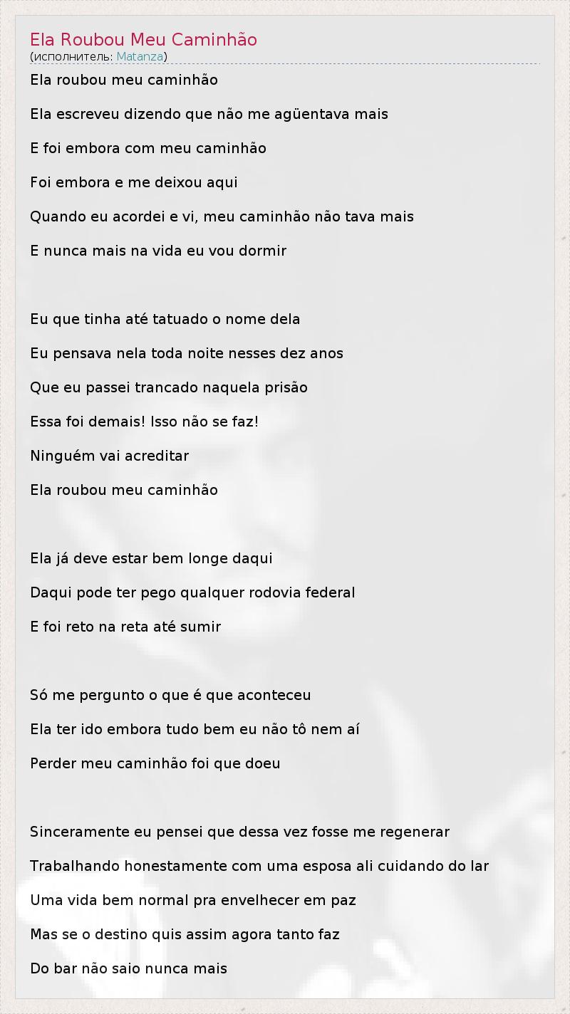 Ela roubou meu caminhão Ela escreveu dizendo que não me agüentava mais E foi embora com meu caminhão Foi embora e me deixou aqui Quando eu acordei e vi, meu caminhão não tava mais E nunca mais na vida eu vou dormir Eu que tinha até tatuado o nome dela Eu pensava nela toda noite nesses dez anos Que eu passei trancado naquela prisão Essa foi demais! Isso não se faz! Ninguém vai acreditar Ela roubou meu caminhão Ela já deve estar bem longe daqui Daqui pode ter pego qualquer rodovia federal E foi reto na reta até sumir Só me pergunto o que é que aconteceu Ela ter ido embora tudo bem eu não tô nem aí Perder meu caminhão foi que doeu Sinceramente eu pensei que dessa vez fosse me regenerar Trabalhando honestamente com uma esposa ali cuidando do lar Uma vida bem normal pra envelhecer em paz Mas se o destino quis assim agora tanto faz Do bar não saio nunca mais