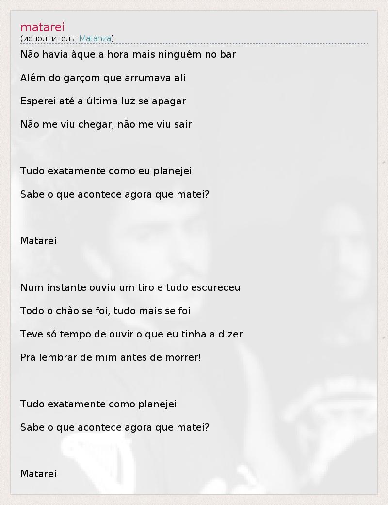 Não havia àquela hora mais ninguém no bar Além do garçom que arrumava ali Esperei até a última luz se apagar Não me viu chegar, não me viu sair Tudo exatamente como eu planejei Sabe o que acontece agora que matei? Matarei Num instante ouviu um tiro e tudo escureceu Todo o chão se foi, tudo mais se foi Teve só tempo de ouvir o que eu tinha a dizer Pra lembrar de mim antes de morrer! Tudo exatamente como planejei Sabe o que acontece agora que matei? Matarei