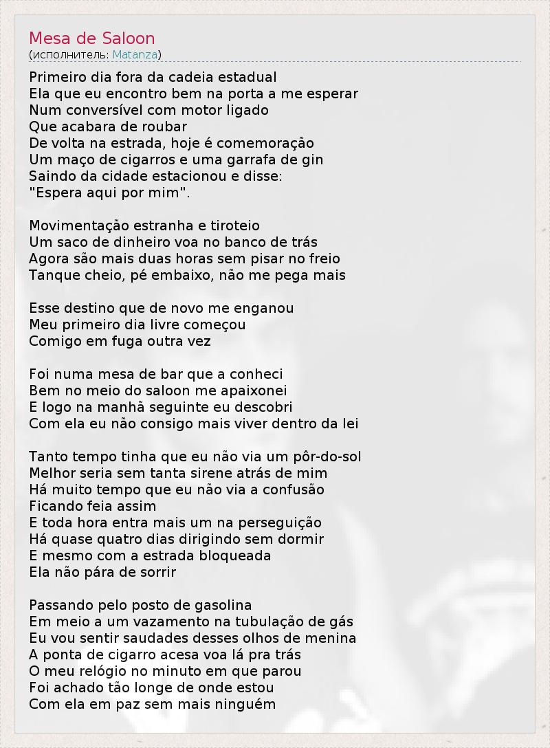 Primeiro диаметром форумах да cadeia Estadual Эла дие ЕС Encontro BEM па Portaменя esperar Кол conversível ком двигателя Ligado Que acabara де roubar Де Вольта па эстрада , Hoje é comemoração Гм MACO де Cigarros электронной ума Garrafa де джин Saindo да Cidade estacionou е Disse : " Эспера Aqui POR мим " . Movimentação estranha е tiroteio Гм Сако де Dinheiro VOA нет Банко-де- Trás Агора são Mais Duas Horas сем не Pisár не freio Tanque cheio , PE embaixo , não меня PEGA Mais Esse Destino дие заново мне enganou Meu Primeiro диаметром Livre começou Comigo эм фуга Outra Vez Foi NUMA Меса де бар диеconheci Бем не мейо не делать сетка салона меня apaixonei E логотип па manhã seguinte ЕС descobri Com Ela ЕС não consigo Mais Viver Dentro да леев Tanto Tempo tinha дие ЕС não через мкм Пор- делать- золь Melhor Серия сем Танта сирене atrás де мим Há Muito темп дие ЕС não через confusão Ficando Фея Assim E Тода гора ENTRA Mais мкм па perseguição Há quase Quatro Dias dirigindo сем Dormir E mesmo комэстрада Bloqueada Ela não пункт де sorrir Passando Pelo посто -де- GASOLINA Em Meioмкм vazamento па tubulação де gás Eu Vou Sentir Saudades Desses Olhos де Menina Понта-де cigarro acesa VOA lá пра Trás Не O MEU Relógio не Минута эм дие Parou Foi achado Тао корде де Onde Estou Com Ela эм -Пас сем Mais ninguém