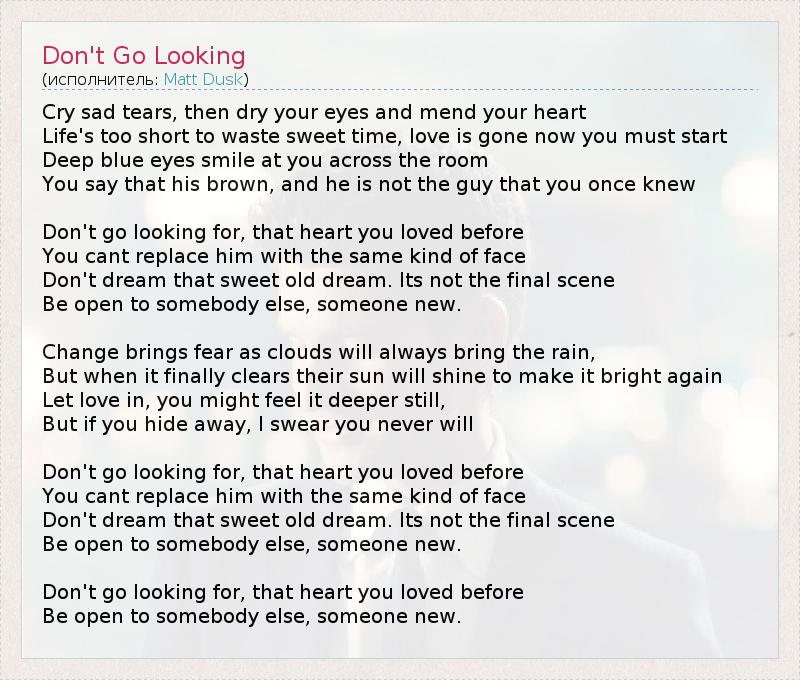 Cry sad tears, then dry your eyes and mend your heart Life's too short to waste sweet time, love is gone now you must start Deep blue eyes smile at you across the room You say that his brown, and he is not the guy that you once knew Don't go looking for, that heart you loved before You cant replace him with the same kind of face Don't dream that sweet old dream. Its not the final scene Be open to somebody else, someone new. Change brings fear as clouds will always bring the rain, But when it finally clears their sun will shine to make it bright again Let love in, you might feel it deeper still, But if you hide away, I swear you never will Don't go looking for, that heart you loved before You cant replace him with the same kind of face Don't dream that sweet old dream. Its not the final scene Be open to somebody else, someone new. Don't go looking for, that heart you loved before Be open to somebody else, someone new.
