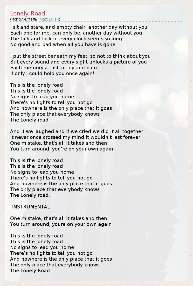 I sit and stare, and empty chair, another day without you Each one for me, can only be, another day without you The tick and tock of every clock seems so long No good and bad when all you have is gone I put the street beneath my feet, so not to think about you But every sound and every sight unlocks a picture of you Each memory a rush of joy and pain If only I could hold you once again! This is the lonely road This is the lonely road No signs to lead you home There's no lights to tell you not go And nowhere is the only place that it goes The only place that everybody knows The Lonely road. And if we laughed and if we cried we did it all together It never once crossed my mind it wouldn't last forever One mistake, that's all it takes and then You turn around, you're on your own again This is the lonely road This is the lonely road No signs to lead you home There's no lights to tell you not go And nowhere is the only place that it goes The only place that everybody knows The Lonely road. [INSTRUMENTAL] One mistake, that's all it takes and then You turn around, youre on your own again This is the lonely road This is the lonely road No signs to lead you home There's no lights to tell you not go And nowhere is the only place that it goes The only place that everybody knows The Lonely Road