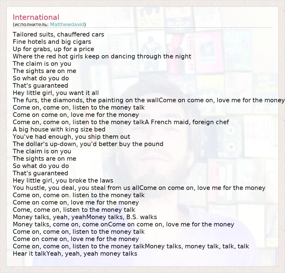 Come on, come on, listen to the money talkMoney talks, money talk, talk, talk