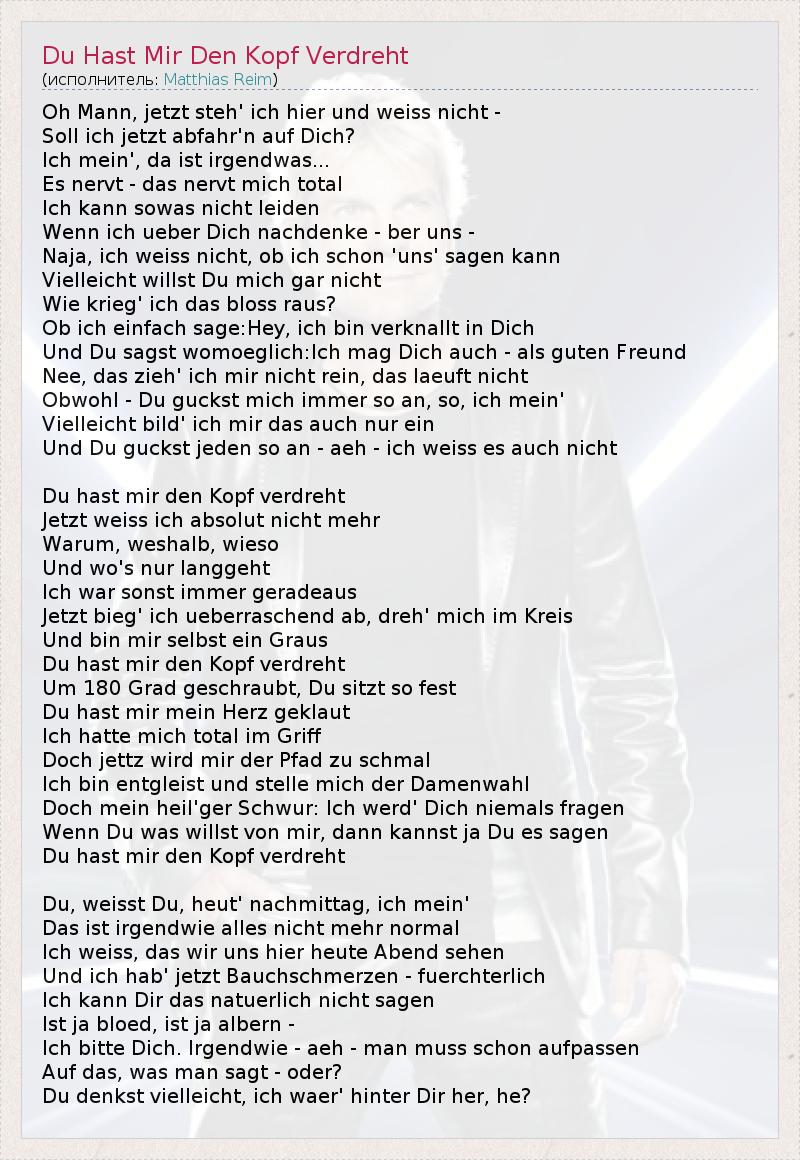 Oh Mann, jetzt steh' ich hier und weiss nicht - Soll ich jetzt abfahr'n auf Dich? Ich mein', da ist irgendwas... Es nervt - das nervt mich total Ich kann sowas nicht leiden Wenn ich ueber Dich nachdenke - ber uns - Naja, ich weiss nicht, ob ich schon 'uns' sagen kann Vielleicht willst Du mich gar nicht Wie krieg' ich das bloss raus? Ob ich einfach sage:Hey, ich bin verknallt in Dich Und Du sagst womoeglich:Ich mag Dich auch - als guten Freund Nee, das zieh' ich mir nicht rein, das laeuft nicht Obwohl - Du guckst mich immer so an, so, ich mein' Vielleicht bild' ich mir das auch nur ein Und Du guckst jeden so an - aeh - ich weiss es auch nicht Du hast mir den Kopf verdreht Jetzt weiss ich absolut nicht mehr Warum, weshalb, wieso Und wo's nur langgeht Ich war sonst immer geradeaus Jetzt bieg' ich ueberraschend ab, dreh' mich im Kreis Und bin mir selbst ein Graus Du hast mir den Kopf verdreht Um 180 Grad geschraubt, Du sitzt so fest Du hast mir mein Herz geklaut Ich hatte mich total im Griff Doch jettz wird mir der Pfad zu schmal Ich bin entgleist und stelle mich der Damenwahl Doch mein heil'ger Schwur: Ich werd' Dich niemals fragen Wenn Du was willst von mir, dann kannst ja Du es sagen Du hast mir den Kopf verdreht Du, weisst Du, heut' nachmittag, ich mein' Das ist irgendwie alles nicht mehr normal Ich weiss, das wir uns hier heute Abend sehen Und ich hab' jetzt Bauchschmerzen - fuerchterlich Ich kann Dir das natuerlich nicht sagen Ist ja bloed, ist ja albern - Ich bitte Dich. Irgendwie - aeh - man muss schon aufpassen Auf das, was man sagt - oder? Du denkst vielleicht, ich waer' hinter Dir her, he?