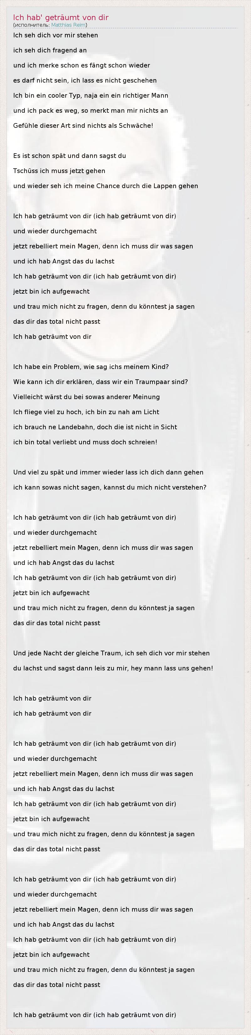 Ich seh dich vor mir stehen ich seh dich fragend an und ich merke schon es fängt schon wieder es darf nicht sein, ich lass es nicht geschehen Ich bin ein cooler Typ, naja ein ein richtiger Mann und ich pack es weg, so merkt man mir nichts an Gefühle dieser Art sind nichts als Schwäche! Es ist schon spät und dann sagst du Tschüss ich muss jetzt gehen und wieder seh ich meine Chance durch die Lappen gehen Ich hab geträumt von dir (ich hab geträumt von dir) und wieder durchgemacht jetzt rebelliert mein Magen, denn ich muss dir was sagen und ich hab Angst das du lachst Ich hab geträumt von dir (ich hab geträumt von dir) jetzt bin ich aufgewacht und trau mich nicht zu fragen, denn du könntest ja sagen das dir das total nicht passt Ich hab geträumt von dir Ich habe ein Problem, wie sag ichs meinem Kind? Wie kann ich dir erklären, dass wir ein Traumpaar sind? Vielleicht wärst du bei sowas anderer Meinung Ich fliege viel zu hoch, ich bin zu nah am Licht ich brauch ne Landebahn, doch die ist nicht in Sicht ich bin total verliebt und muss doch schreien! Und viel zu spät und immer wieder lass ich dich dann gehen ich kann sowas nicht sagen, kannst du mich nicht verstehen? Ich hab geträumt von dir (ich hab geträumt von dir) und wieder durchgemacht jetzt rebelliert mein Magen, denn ich muss dir was sagen und ich hab Angst das du lachst Ich hab geträumt von dir (ich hab geträumt von dir) jetzt bin ich aufgewacht und trau mich nicht zu fragen, denn du könntest ja sagen das dir das total nicht passt Und jede Nacht der gleiche Traum, ich seh dich vor mir stehen du lachst und sagst dann leis zu mir, hey mann lass uns gehen! Ich hab geträumt von dir ich hab geträumt von dir Ich hab geträumt von dir (ich hab geträumt von dir) und wieder durchgemacht jetzt rebelliert mein Magen, denn ich muss dir was sagen und ich hab Angst das du lachst Ich hab geträumt von dir (ich hab geträumt von dir) jetzt bin ich aufgewacht und trau mich nicht zu fragen, denn du könntest ja sagen das dir das total nicht passt Ich hab geträumt von dir (ich hab geträumt von dir) und wieder durchgemacht jetzt rebelliert mein Magen, denn ich muss dir was sagen und ich hab Angst das du lachst Ich hab geträumt von dir (ich hab geträumt von dir) jetzt bin ich aufgewacht und trau mich nicht zu fragen, denn du könntest ja sagen das dir das total nicht passt Ich hab geträumt von dir (ich hab geträumt von dir)