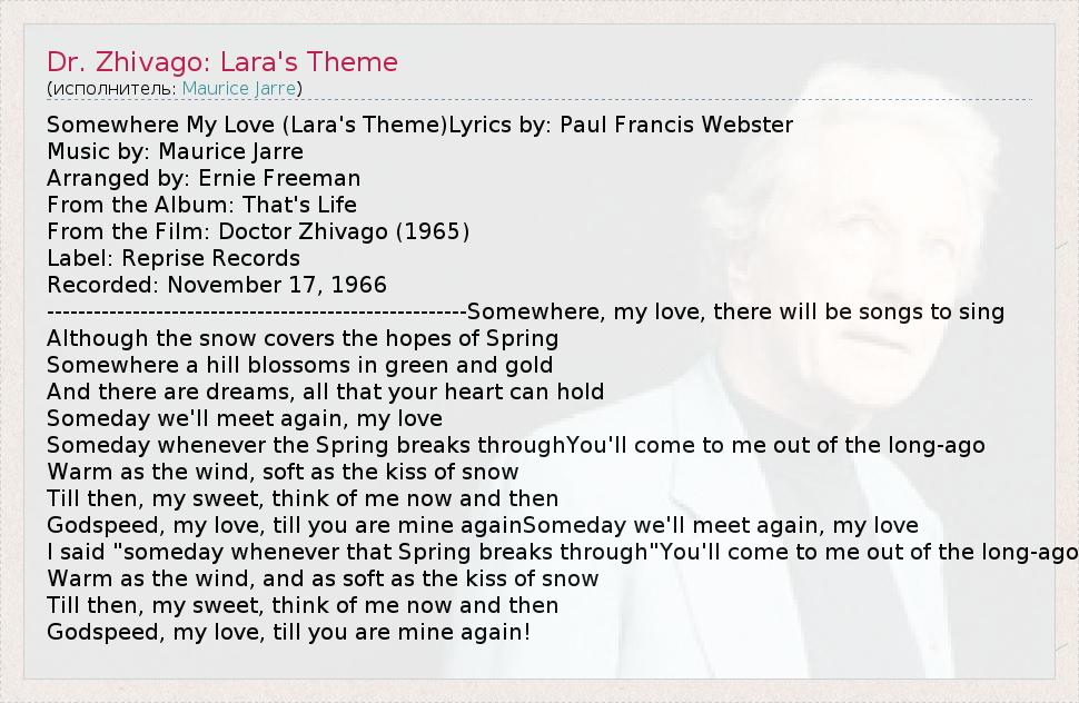 Somewhere My Love (Lara's Theme)Lyrics by: Paul Francis Webster Music by: Maurice Jarre Arranged by: Ernie Freeman From the Album: That's Life From the Film: Doctor Zhivago (1965) Label: Reprise Records Recorded: November 17, 1966 ------------------------------------------------------Somewhere, my love, there will be songs to sing Although the snow covers the hopes of Spring Somewhere a hill blossoms in green and gold And there are dreams, all that your heart can hold Someday we'll meet again, my love Someday whenever the Spring breaks throughYou'll come to me out of the long-ago Warm as the wind, soft as the kiss of snow Till then, my sweet, think of me now and then Godspeed, my love, till you are mine againSomeday we'll meet again, my love I said "someday whenever that Spring breaks through"You'll come to me out of the long-ago Warm as the wind, and as soft as the kiss of snow Till then, my sweet, think of me now and then Godspeed, my love, till you are mine again!