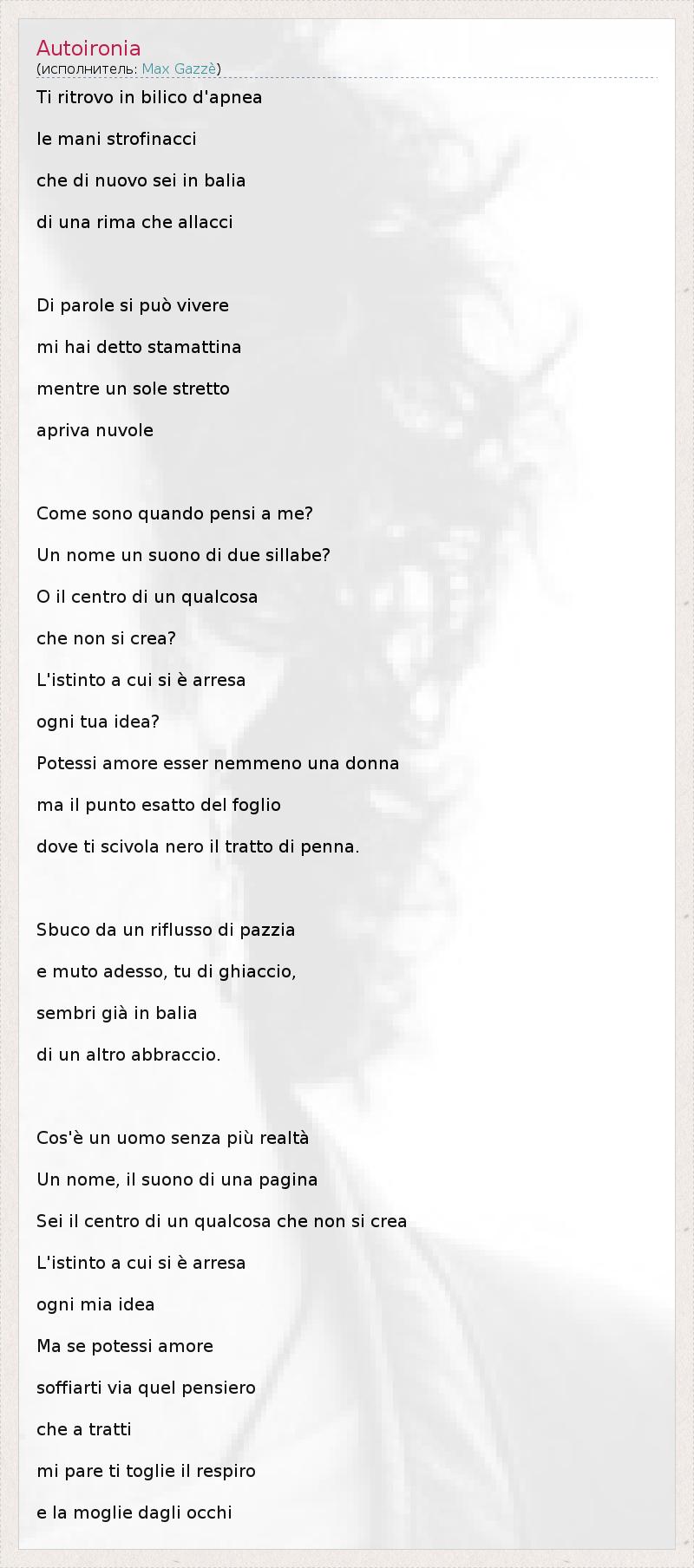 Ti ritrovo in bilico d'apnea le mani strofinacci che di nuovo sei in balia di una rima che allacci Di parole si può vivere mi hai detto stamattina mentre un sole stretto apriva nuvole Come sono quando pensi a me? Un nome un suono di due sillabe? O il centro di un qualcosa che non si crea? L'istinto a cui si è arresa ogni tua idea? Potessi amore esser nemmeno una donna ma il punto esatto del foglio dove ti scivola nero il tratto di penna. Sbuco da un riflusso di pazzia e muto adesso, tu di ghiaccio, sembri già in balia di un altro abbraccio. Cos'è un uomo senza più realtà Un nome, il suono di una pagina Sei il centro di un qualcosa che non si crea L'istinto a cui si è arresa ogni mia idea Ma se potessi amore soffiarti via quel pensiero che a tratti mi pare ti toglie il respiro e la moglie dagli occhi