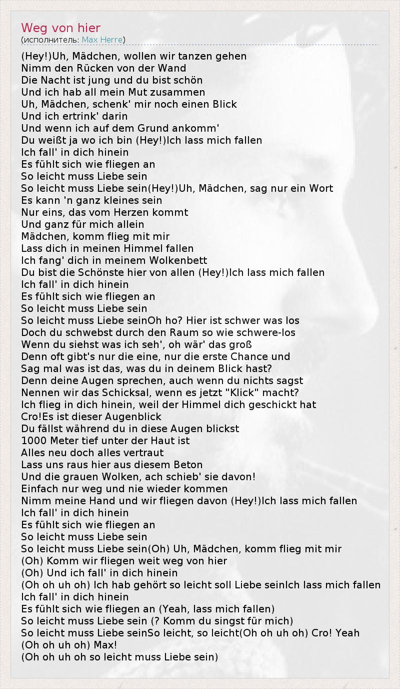 (Hey!)Uh, Mädchen, wollen wir tanzen gehen Nimm den Rücken von der Wand Die Nacht ist jung und du bist schön Und ich hab all mein Mut zusammen Uh, Mädchen, schenk' mir noch einen Blick Und ich ertrink' darin Und wenn ich auf dem Grund ankomm' Du weißt ja wo ich bin (Hey!)Ich lass mich fallen Ich fall' in dich hinein Es fühlt sich wie fliegen an So leicht muss Liebe sein So leicht muss Liebe sein(Hey!)Uh, Mädchen, sag nur ein Wort Es kann 'n ganz kleines sein Nur eins, das vom Herzen kommt Und ganz für mich allein Mädchen, komm flieg mit mir Lass dich in meinen Himmel fallen Ich fang' dich in meinem Wolkenbett Du bist die Schönste hier von allen (Hey!)Ich lass mich fallen Ich fall' in dich hinein Es fühlt sich wie fliegen an So leicht muss Liebe sein So leicht muss Liebe seinOh ho? Hier ist schwer was los Doch du schwebst durch den Raum so wie schwere-los Wenn du siehst was ich seh', oh wär' das groß Denn oft gibt's nur die eine, nur die erste Chance und Sag mal was ist das, was du in deinem Blick hast? Denn deine Augen sprechen, auch wenn du nichts sagst Nennen wir das Schicksal, wenn es jetzt "Klick" macht? Ich flieg in dich hinein, weil der Himmel dich geschickt hat Cro!Es ist dieser Augenblick Du fällst während du in diese Augen blickst 1000 Meter tief unter der Haut ist Alles neu doch alles vertraut Lass uns raus hier aus diesem Beton Und die grauen Wolken, ach schieb' sie davon! Einfach nur weg und nie wieder kommen Nimm meine Hand und wir fliegen davon (Hey!)Ich lass mich fallen Ich fall' in dich hinein Es fühlt sich wie fliegen an So leicht muss Liebe sein So leicht muss Liebe sein(Oh) Uh, Mädchen, komm flieg mit mir (Oh) Komm wir fliegen weit weg von hier (Oh) Und ich fall' in dich hinein (Oh oh uh oh) Ich hab gehört so leicht soll Liebe seinIch lass mich fallen Ich fall' in dich hinein Es fühlt sich wie fliegen an (Yeah, lass mich fallen) So leicht muss Liebe sein (? Komm du singst für mich) So leicht muss Liebe seinSo leicht, so leicht(Oh oh uh oh) Cro! Yeah (Oh oh uh oh) Max! (Oh oh uh oh so leicht muss Liebe sein)