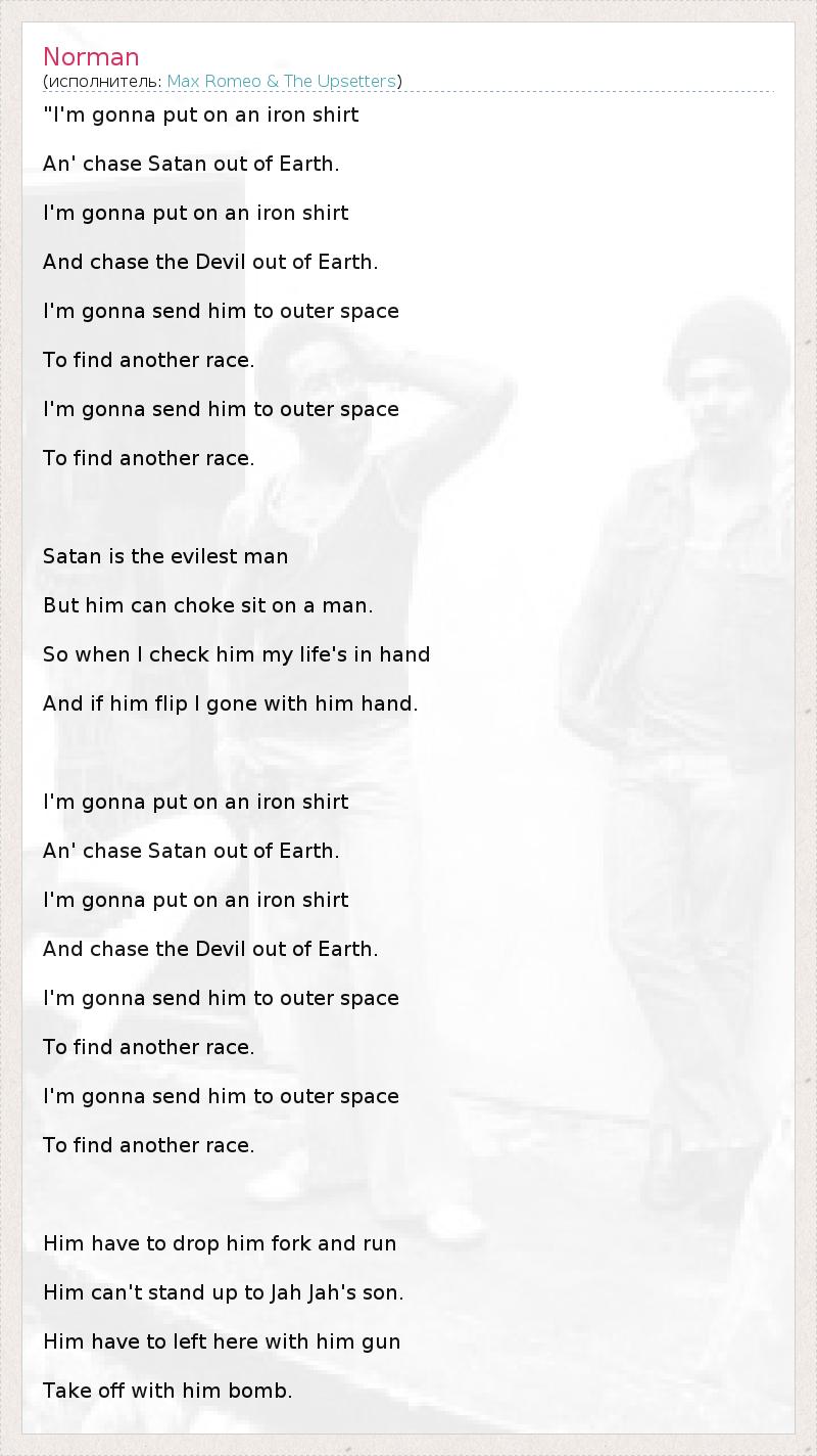 "I'm gonna put on an iron shirt An' chase Satan out of Earth. I'm gonna put on an iron shirt And chase the Devil out of Earth. I'm gonna send him to outer space To find another race. I'm gonna send him to outer space To find another race. Satan is the evilest man But him can choke sit on a man. So when I check him my life's in hand And if him flip I gone with him hand. I'm gonna put on an iron shirt An' chase Satan out of Earth. I'm gonna put on an iron shirt And chase the Devil out of Earth. I'm gonna send him to outer space To find another race. I'm gonna send him to outer space To find another race. Him have to drop him fork and run Him can't stand up to Jah Jah's son. Him have to left here with him gun Take off with him bomb.