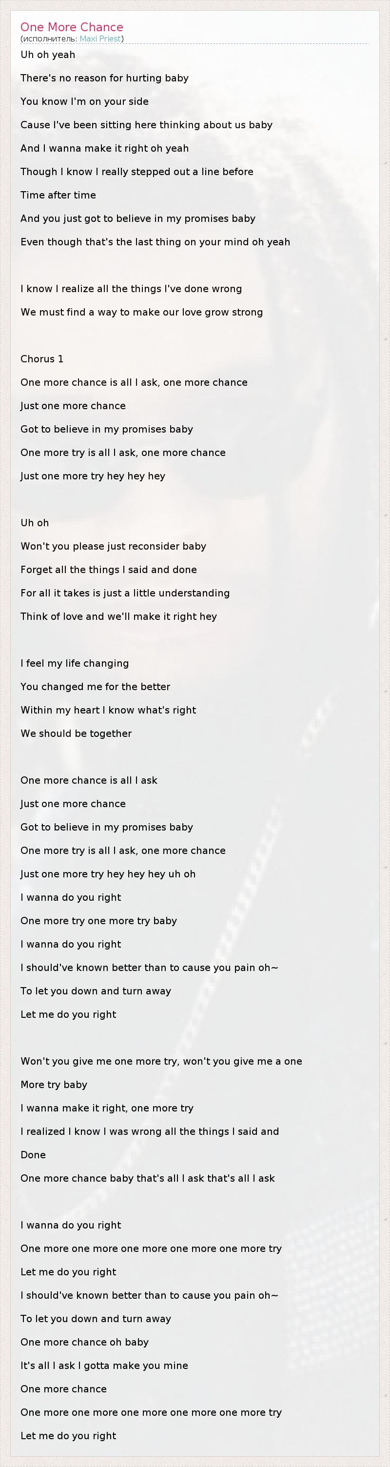 Uh oh yeah There's no reason for hurting baby You know I'm on your side Cause I've been sitting here thinking about us baby And I wanna make it right oh yeah Though I know I really stepped out a line before Time after time And you just got to believe in my promises baby Even though that's the last thing on your mind oh yeah I know I realize all the things I've done wrong We must find a way to make our love grow strong Chorus 1 One more chance is all I ask, one more chance Just one more chance Got to believe in my promises baby One more try is all I ask, one more chance Just one more try hey hey hey Uh oh Won't you please just reconsider baby Forget all the things I said and done For all it takes is just a little understanding Think of love and we'll make it right hey I feel my life changing You changed me for the better Within my heart I know what's right We should be together One more chance is all I ask Just one more chance Got to believe in my promises baby One more try is all I ask, one more chance Just one more try hey hey hey uh oh I wanna do you right One more try one more try baby I wanna do you right I should've known better than to cause you pain oh~ To let you down and turn away Let me do you right Won't you give me one more try, won't you give me a one More try baby I wanna make it right, one more try I realized I know I was wrong all the things I said and Done One more chance baby that's all I ask that's all I ask I wanna do you right One more one more one more one more one more try Let me do you right I should've known better than to cause you pain oh~ To let you down and turn away One more chance oh baby It's all I ask I gotta make you mine One more chance One more one more one more one more one more try Let me do you right
