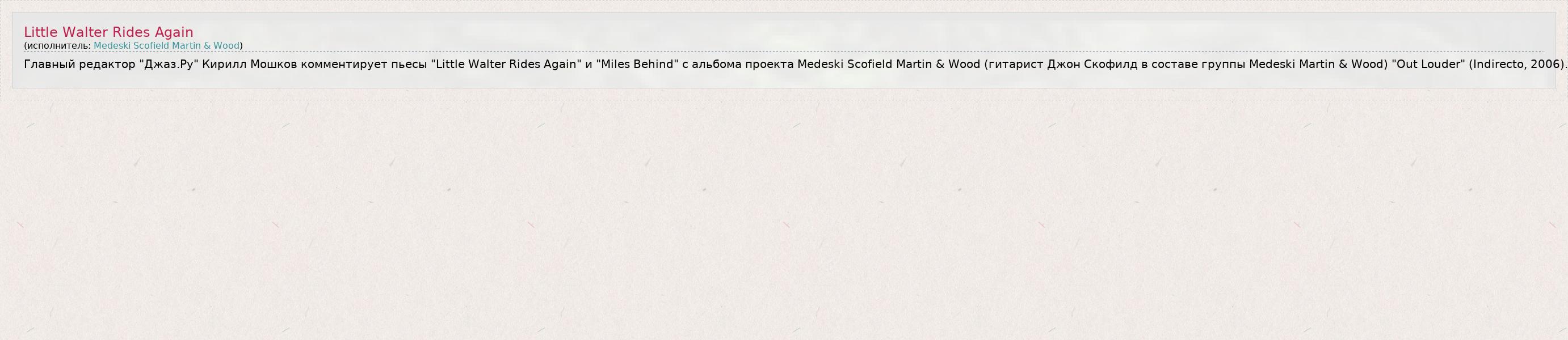 Главный редактор "Джаз.Ру" Кирилл Мошков комментирует пьесы "Little Walter Rides Again" и "Miles Behind" с альбома проекта Medeski Scofield Martin & Wood (гитарист Джон Скофилд в составе группы Medeski Martin & Wood) "Out Louder" (Indirecto, 2006).