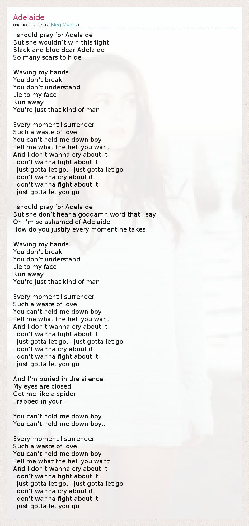 Я должна бы молиться за Аделаиду, Но она не намерена выигрывать эту битву, Ты вся в кровоподтёках, дорогая Аделаида, Столько скрытых шрамов. Машу рукой на прощанье. Ты не сопротивляешься. Ты не понимаешь. Лжешь мне прямо в лицо, Убегаешь прочь, Просто ты такой человек. Каждый раз, когда я уступала, Это такая трата любви. Парень, ты не удержишь меня, Скажи уже, что тебе нужно. Я не хочу плакать об этом, Я не хочу за это бороться. Я просто отпущу это. Просто отпущу это. Я не хочу плакать об этом, Я не хочу за это бороться. Я просто отпускаю тебя. Я должна бы молиться за Аделаиду, Но она не хочет слышать ни слова из того, что я ей говорю. О, мне так стыдно за Аделаиду, Как ты оправдаешь все то время, что он отнял? Машу рукой на прощанье. Ты не сопротивляешься. Ты не понимаешь. Лжешь мне прямо в лицо, Убегаешь прочь, Просто ты такой человек. Каждый раз, когда я уступала, Это такая трата любви. Парень, ты не удержишь меня, Скажи уже, что тебе нужно. Я не хочу плакать об этом, Я не хочу за это бороться. Я просто должна отпустить это, просто должна отпустить. Я не хочу плакать об этом, Я не хочу за это бороться. Я просто должна отпустить тебя. И я похоронена в тишине, Мои глаза закрыты. Поймана, словно пауком, В твою... Ты не удержишь меня, парень, Ты не удержишь меня, парень... Каждый раз, когда я уступала, Это такая трата любви. Парень, ты не удержишь меня, Скажи уже, что тебе нужно. Я не хочу плакать об этом, Я не хочу за это бороться. Я просто должна отпустить это, просто должна отпустить. Я не хочу плакать об этом, Я не хочу за это бороться. Я просто должна отпустить тебя.